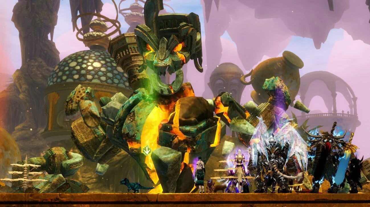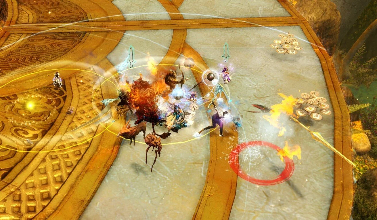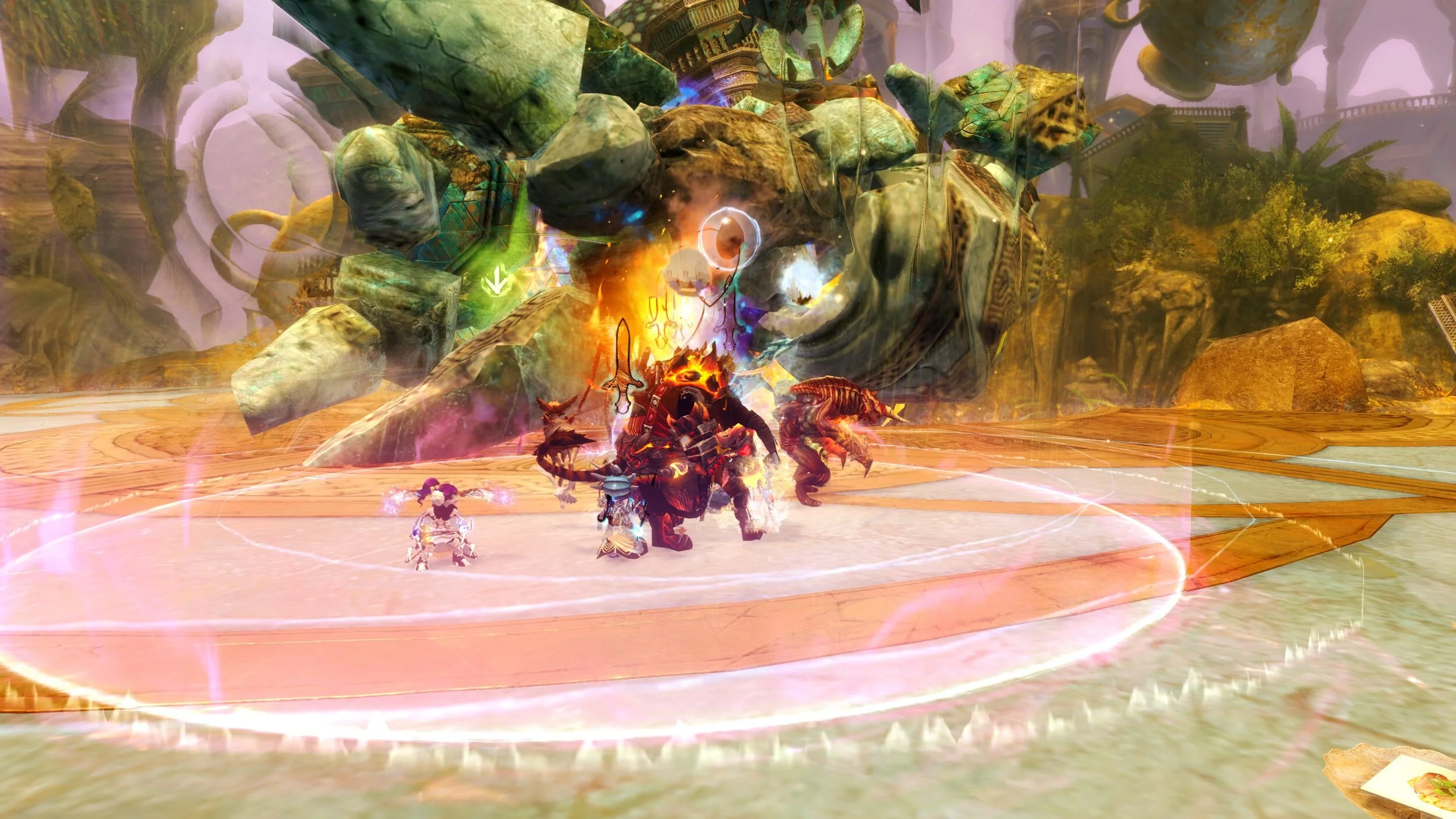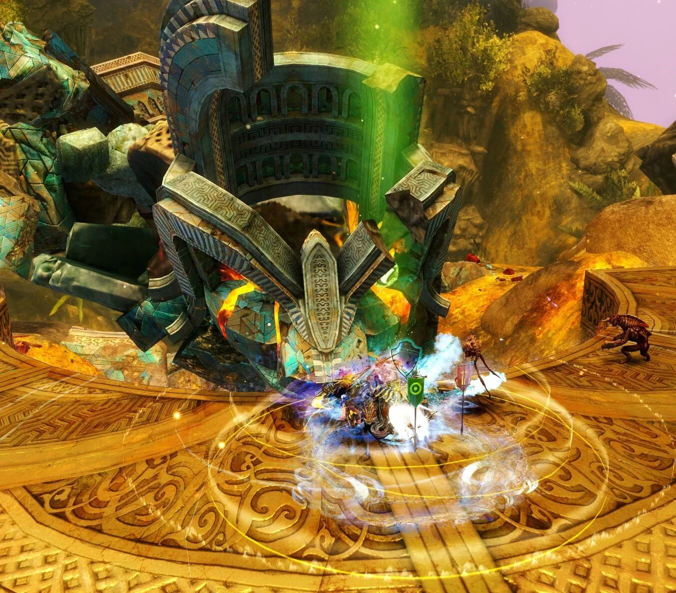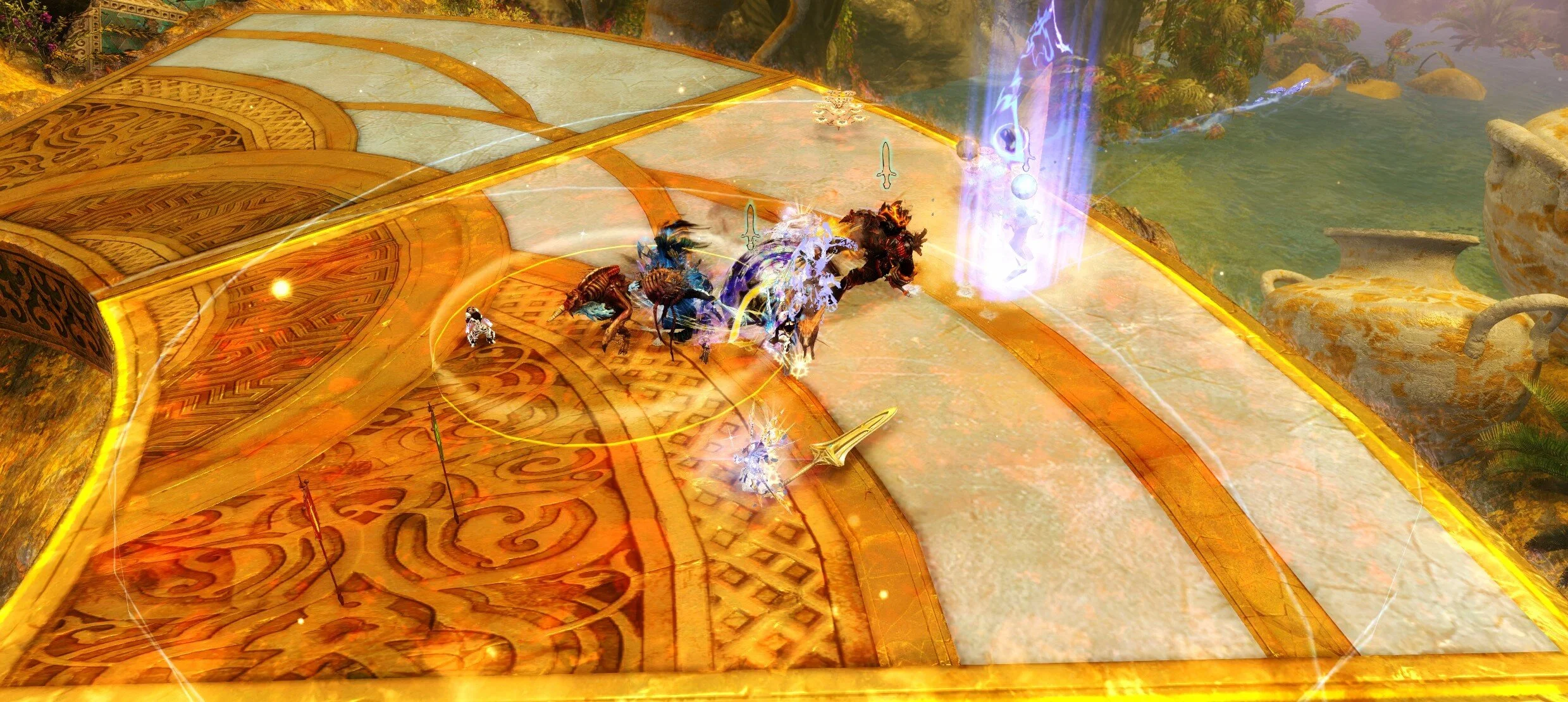 Ist der Arm abgeschlagen sammelt sich die Gruppe bei Pfeil und kann nun die Beschworene Verschmelzung angreifen. Sie erleidet auch wenn sie weit entfernt scheint Schaden. Passt auf das ich wirklich auf dem Pfeil steht und nicht direkt in der Mitte zwischen den Plattformen. Als Gruppe macht man während der Sammelphase nichts anderes als dort zu stehen und den Boss anzugreifen.
