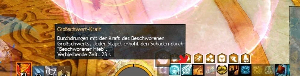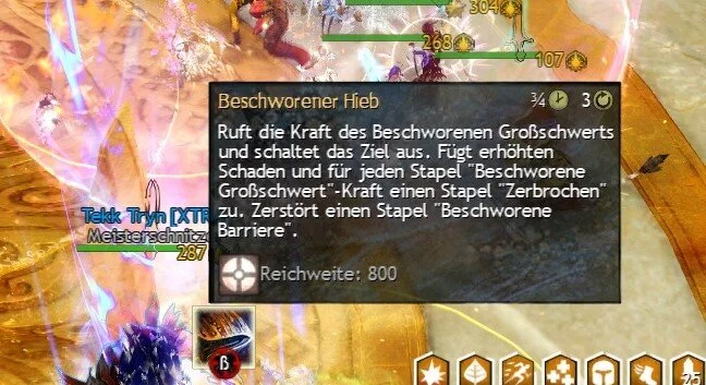 Durch das aufsammeln von Schwertern bekommt man die Spezial-Attacken-Fähigkeit: Beschworener Hieb -> Ruft die Kraft des Beschworene Großschwerts und schaltet das Ziel aus. Fügt erhöhten Schaden und für jeden Stapel “Beschworene Großschwert”-Kraft einen Stapel “Zerbrochen” zu. Zerstört einen Stapel “Beschworene Barriere”.
