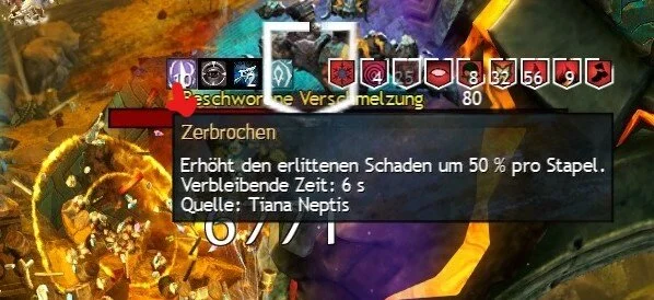 Ziel ist es den Arm abzuschlagen und in die Sammelphase zu kommen. Durch das Abschlagen des Arms verliert die Beschworene Verschmelzung wieder 10% Leben. Ihr müsst also nur noch die restlich 15% töten. Die Gruppe sammelt sich links von Pfeil (WICHTIG! Sonst trifft euch mitunter der andere Arm) und die Läufer sammeln wieder Schwerter und Schilder ein.