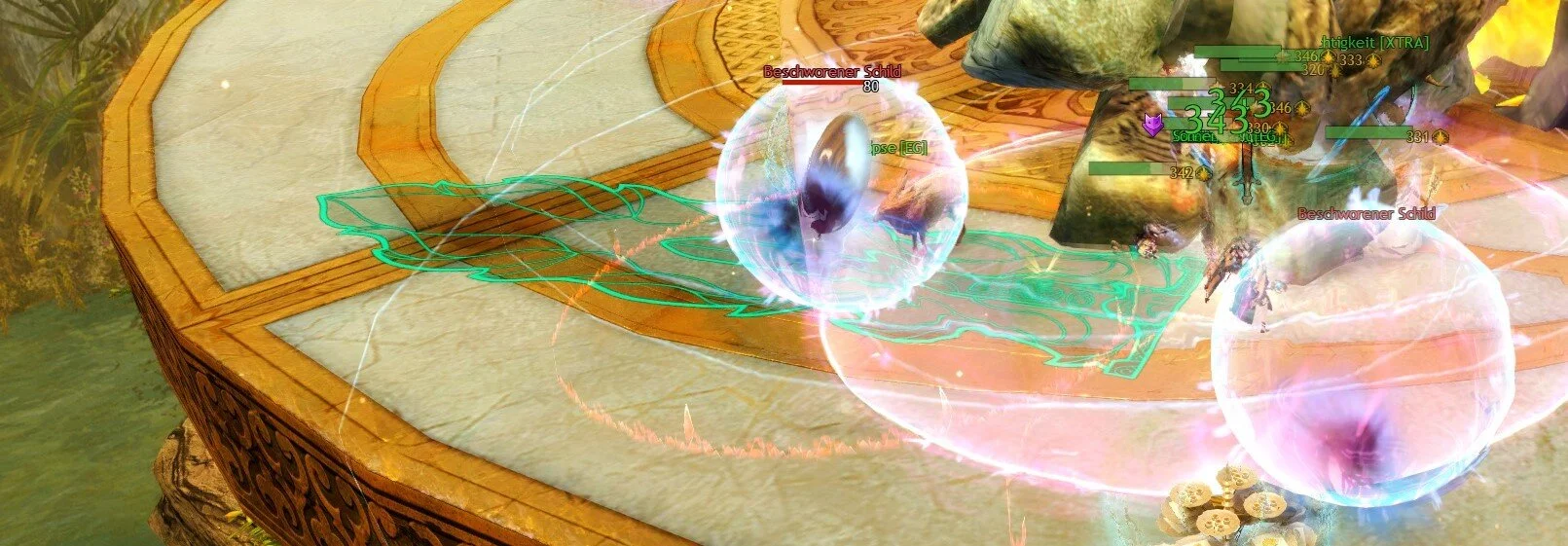 Macht als Gruppe wieder Schaden auf die Beschworene Verschmelzung und versucht sie zu töten. Schild 1 schützt die Gruppe vor der Dreckschleuder, die jetzt wieder nur einmal über die Plattformen fährt. Solltet ihr in der anschließenden Phase nicht auf 0% kommen müsst ihr den anderen Arm auch noch abschlagen, dies sollte aber dann reichen um sie zu töten.