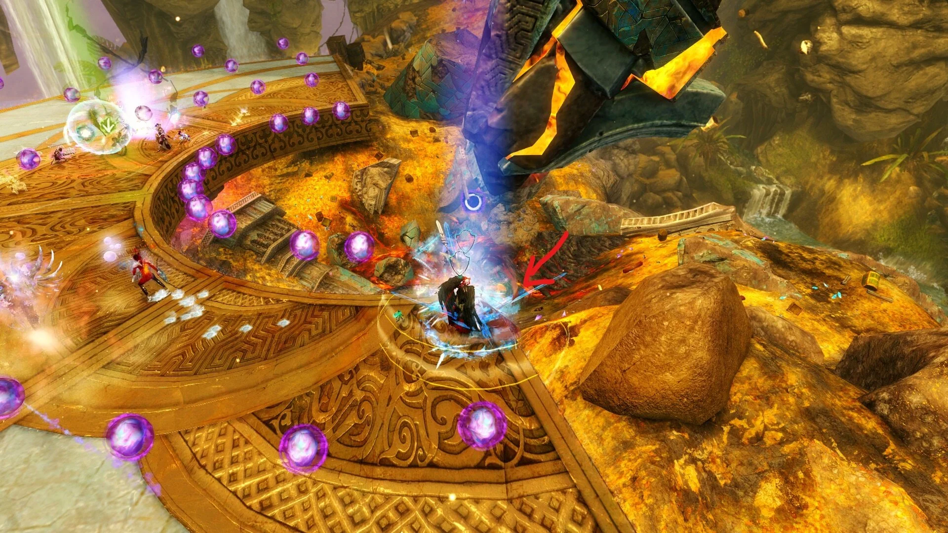 Insgesamt erscheinen 15 Schwerter, die gesammelt (man sammelt ein Schwert ein, indem man durch die entsprechende Kugel läuft) werden müssen. Die Sammelphase an sich dauert 20 Sekunden. Habt ihr das erste Schwert gesammelt, erscheinen die Folgenden immer so, dass ihr Richtung Kreis laufen müsst. Bei Kreis dreht ihr um und lauft wieder zu Pfeil, um den Rest einzusammeln. Habt ihr alle eingesammelt trefft ihr euch wieder bei der Gruppe.