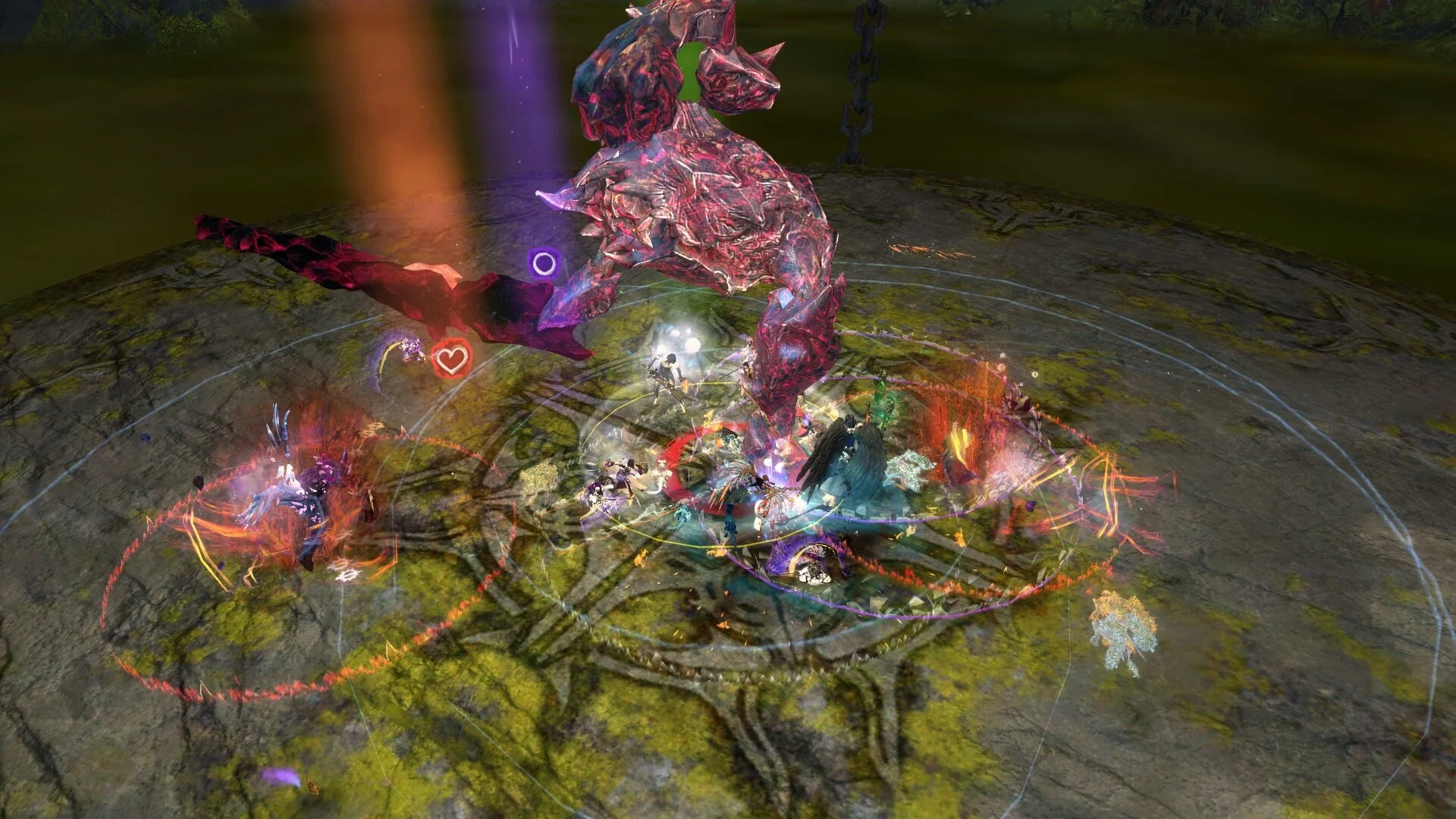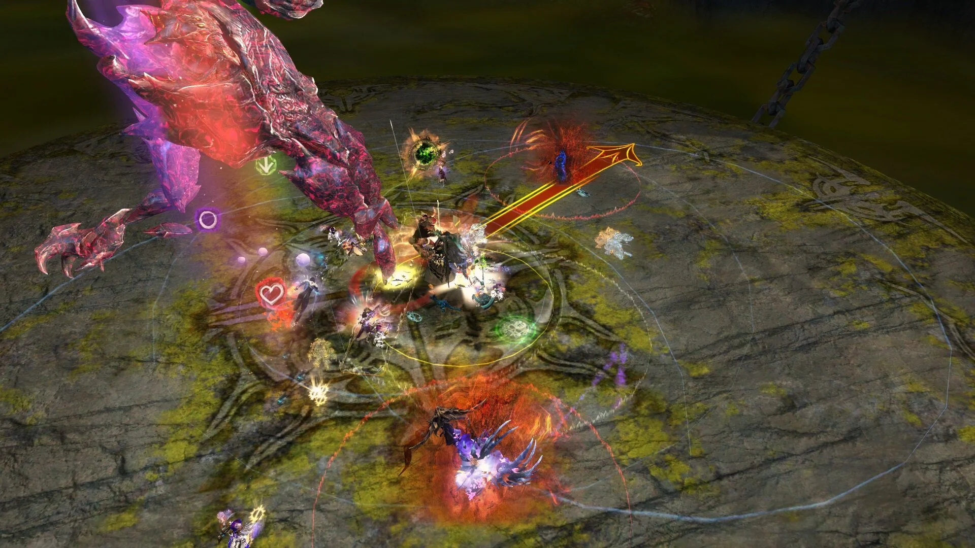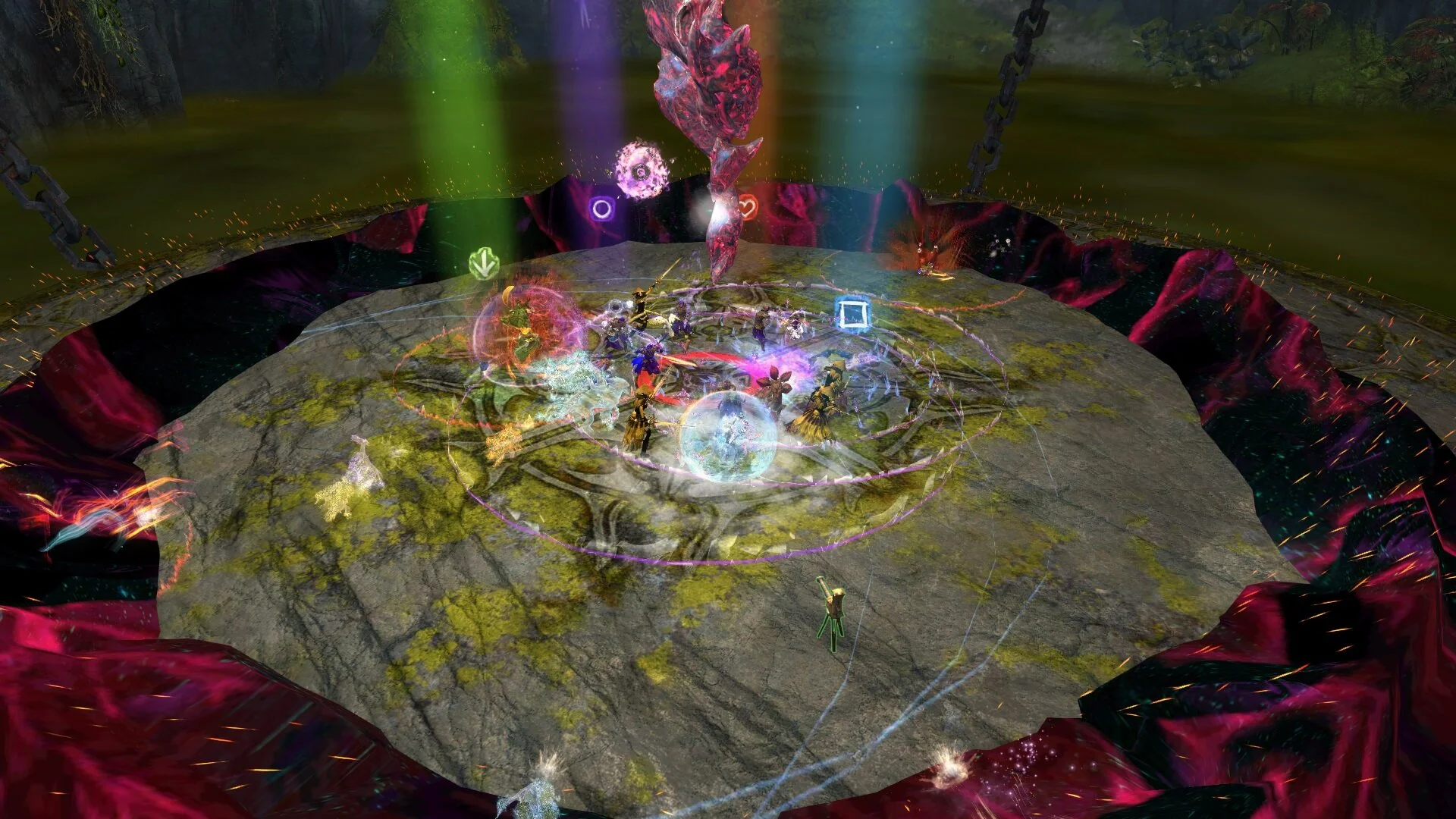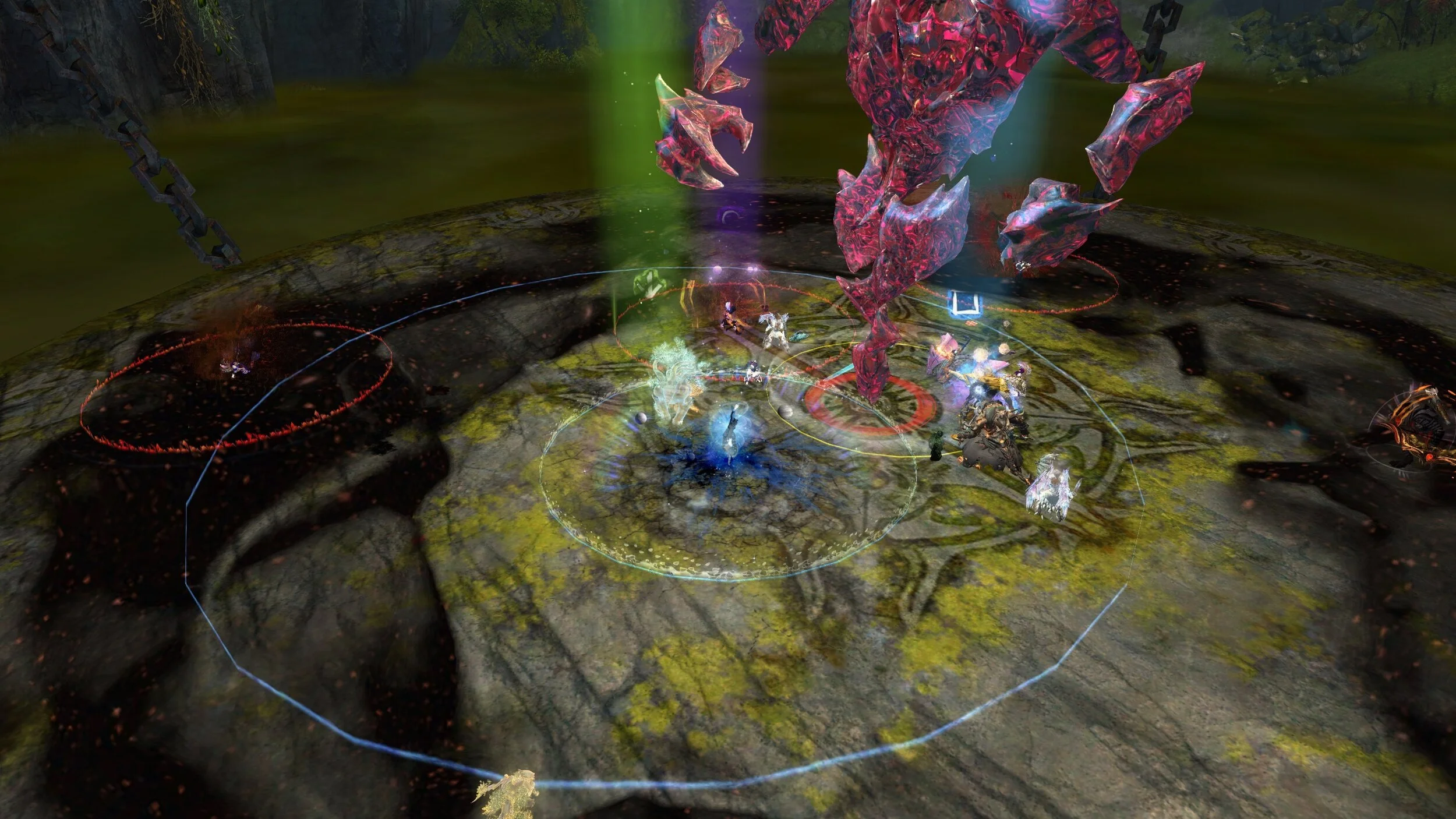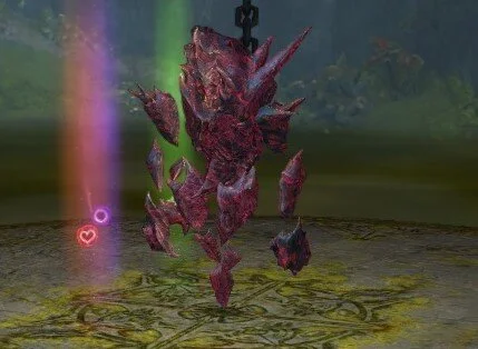 Geteilte Qual wird alle 20 Sekunden an einen Spieler vergeben der am weitesten von Cairn weg steht. Ihr habt oben bereits festgelegt wer diese drei Personen sind. Der Kiter bekommt als erstes den roten Kreis, 20 Sekunden später muss dann ein Chronomant am weitesten entfernt stehen, damit er den zweiten roten Kreis bekommt und wieder 20 Sekunden später der andere Chronomant. Die beiden Chronomanten positionieren sich nun auf den anderen beiden Marker: bei uns Kreis und Pfeil. Sie sollten noch im inneren Kreis stehen (damit die Scherben sie nicht treffen), aber soweit von der Gruppe entfernt das ihre roten Felder die Gruppe nicht berühren. Es können maximal 3 Spieler gleichzeitig geteilte Qual haben.