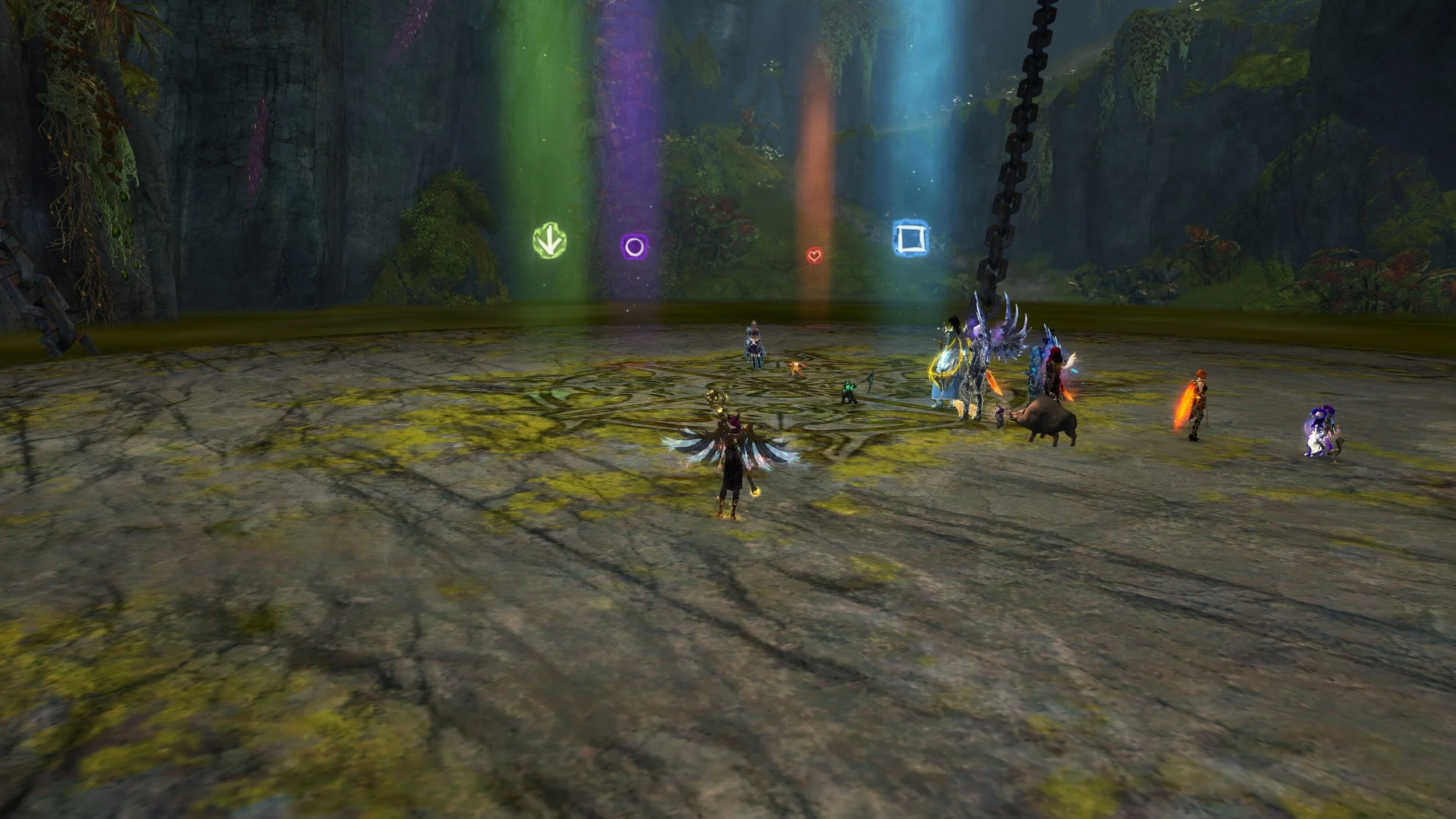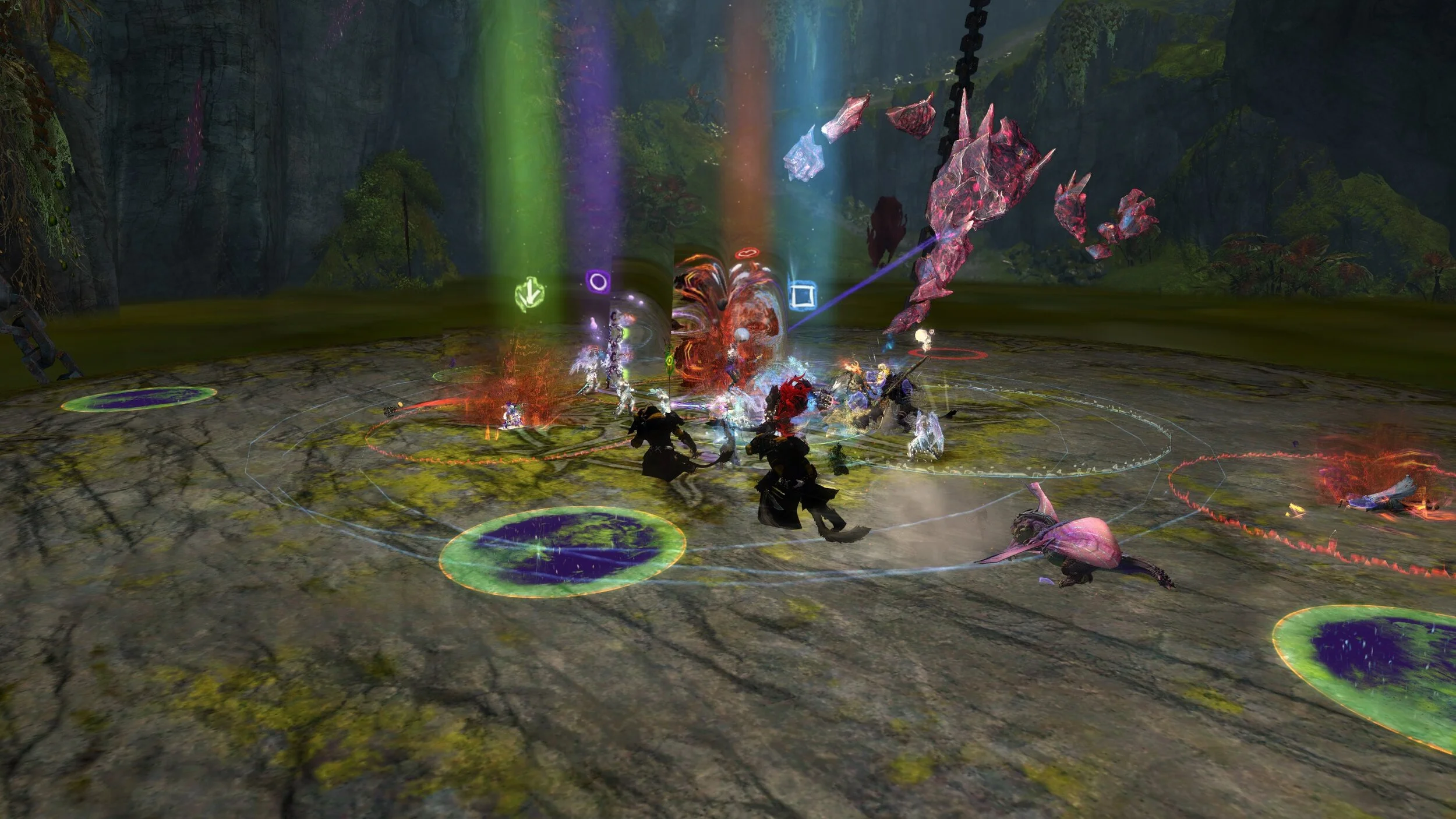 Die Gruppe versucht so nahe wie möglich an Cairn zu stehen, innerhalb es inneren Kreises und macht nun Schaden. Habt dabei immer ein Auge auf die Teleportationsfelder.