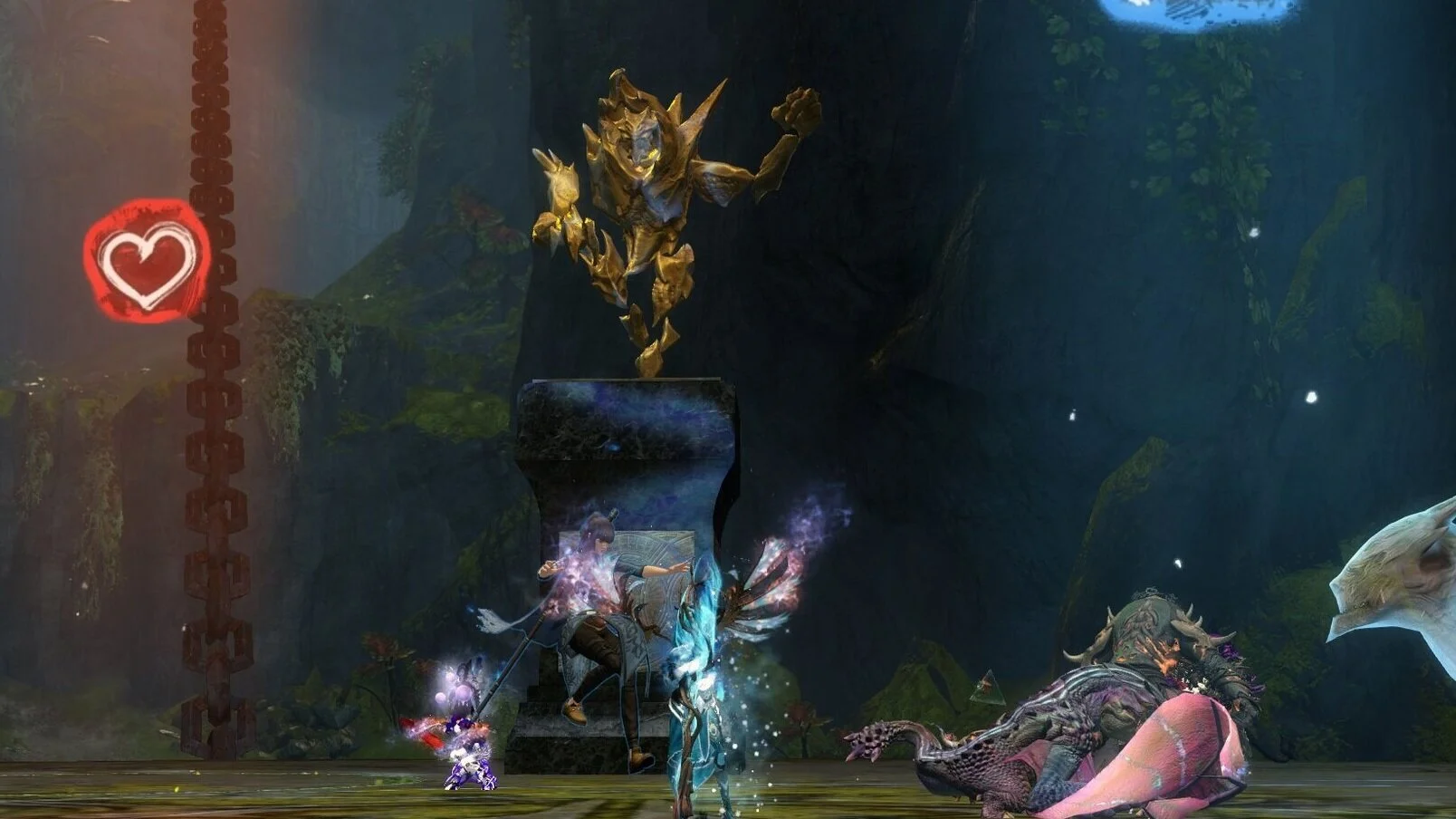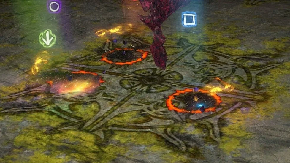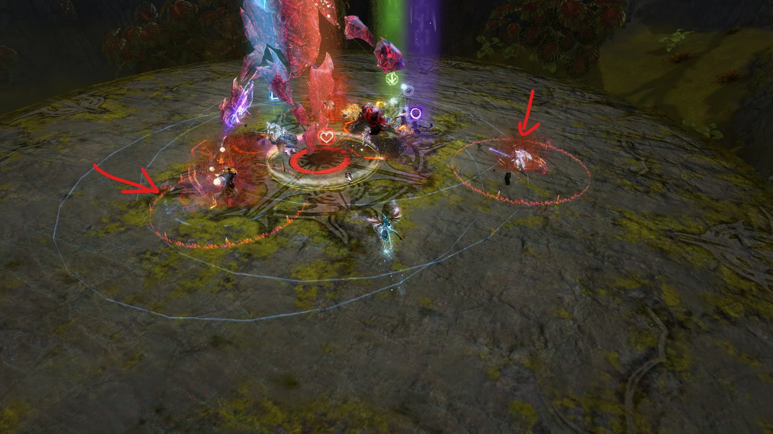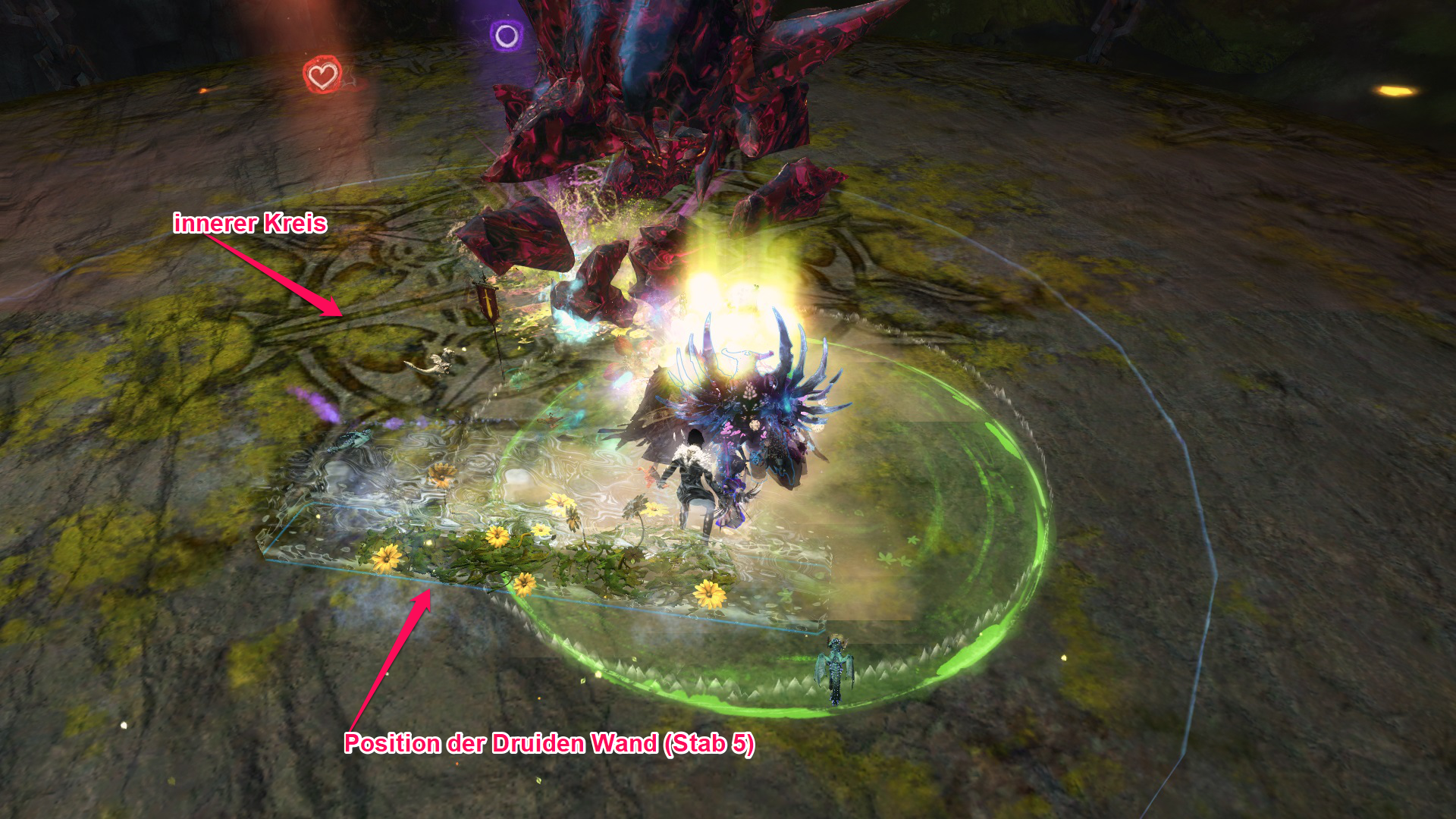 Nach dem ersten grünen Feld sammelt sich nun die Gruppe bei Viereck und der Druiden Kiter stellt sich auf die gegenüberliegende Seite auf den Herz Marker um die orange-roten Scherben zu kiten, da Cairn diese ja auf den am weitest entfernten Speiler wirft. Man kann dieser Scherben wieder mit der Wand umwandeln oder ihnen einfach ausweichen.