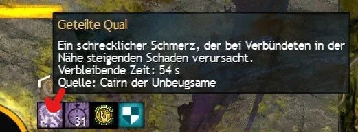 Nach ca 20 Sekunden, also etwa bei 7:40, wird der Druiden Kiter einen roten Kreis um sich bekommen. Er bekommt ebenfalls einen Debuff: Geteilte Qual = Ein schrecklicher Schmerz, der bei Verbündeten in der Nähe steigenden Schaden verursacht. Geteilte Qual, also der rote Kreis trefft ebenfalls immer den Spieler der am weitesten von Cairn entfernt steht. Habt ihr den roten Kreis und greift an bekommt ihr Schaden, stehen andere Spieler in dem roten Feld von euch, bekommen diese ebenfalls Schaden. Greift ihr an, während andere Spieler in eurem roten Feld stehen, bekommen sie deutlich mehr Schaden.