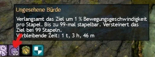Nein mal im Ernst. Die ungesehen Bürde ist zu Beginn des Kampfes eigentlich wirklich nicht schlimm, vielleicht etwas mühsam. Aber später kann sie zu einem echten Problem werden, gerade wenn man einige grüne Felder verpasst hat. Wir man getroffen, egal von was, bekommt man Stapel ungesehene Bürde: Verlangsamt das Ziel um 1% Bewegungsgeschwindigkeit pro Stapel. Bis 99-mal stapelbar- Versteinert das Ziel bei 99 Stapeln.