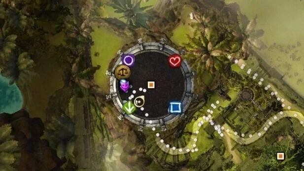 Sind die Klassen gewählt setzt der Kommandeur 4 Marker auf die 4 Brunnen. Die Gruppe sollte sich nun entscheiden bei welchem der Marker sie startet will. Wir empfehlen: Pfeil -> Kreis -> Herz -> Viereck. Hier geht es darum wo der nächste Brunnen angelaufen wird, nachdem einer benutzt wurde (alles weitere wird unten ausführlich erklärt).