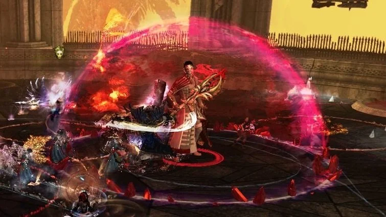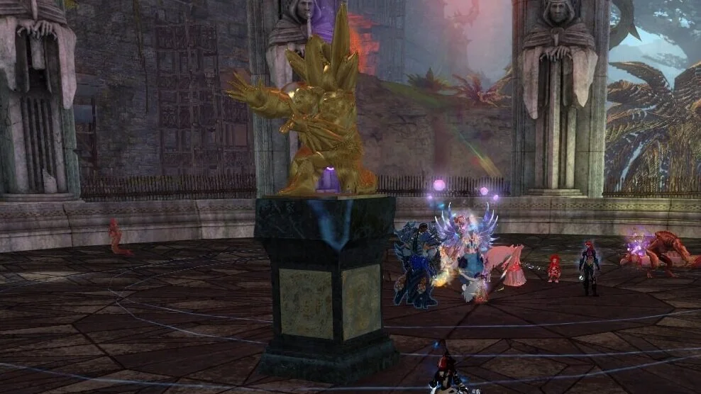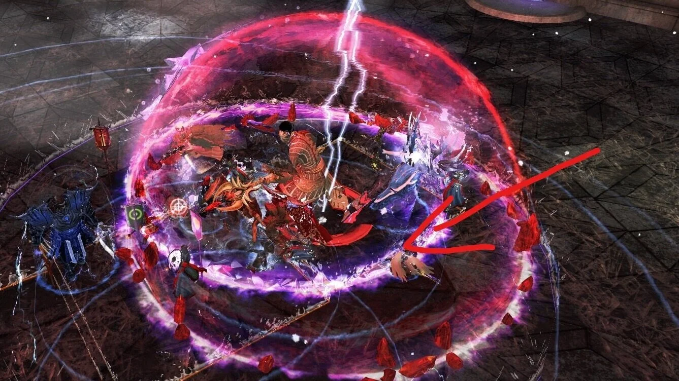 Sind alle bereit läuft die Gruppe in die Mitte und greift Matthias an. Man kann nun ein bis zwei Angriffe auf ihm machen bevor er das erste mal seine rote Blutsteinkuppel bekommt. Sobald der die Blutsteinkuppel gesetzt hat wird er 18 Stapel eines Buffs bekommen der ihn unverwundbar macht. Ist dieser Buff erschienen muss ein Mirage sofort Reaktion über Matthias legen. Matthias wir nämlich eine Attacke machen die einer Maschinenpistole gleicht und Bluststeine verschießt. Reflektiert man die Blutsteine auf ihn zurück nimmt ihm das die Stapel des Buffs und er wird wieder angreifbar. Generell kann man auch alle anderen Fähigkeiten benutzen, die Projektile reflektieren. Mit der Reaktion vom Mesmer ist es aber am einfachsten. Die Blutsteinkuppel setzt Matthias alle 40 Sekunden.
