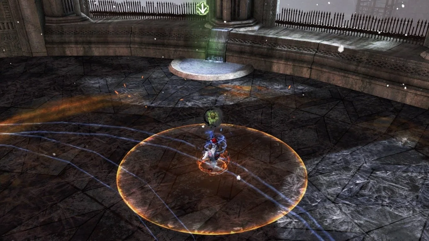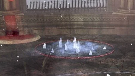 Die Gruppe sammelt sich zwischen Pfeil und Kreis. Im Gegensatz zu vielen anderen Bossen kann man relativ nah an Matthias heran gehen. Doch auch hier vorsichtig, wenn man zu nahe an ihm dran steht startet der Kampf. Sobald der Kampf gestartet ist schließen sich die Türen des Raumes, die Gruppe ist nun gefangen.