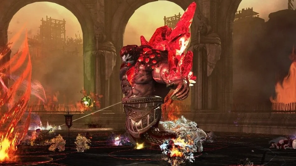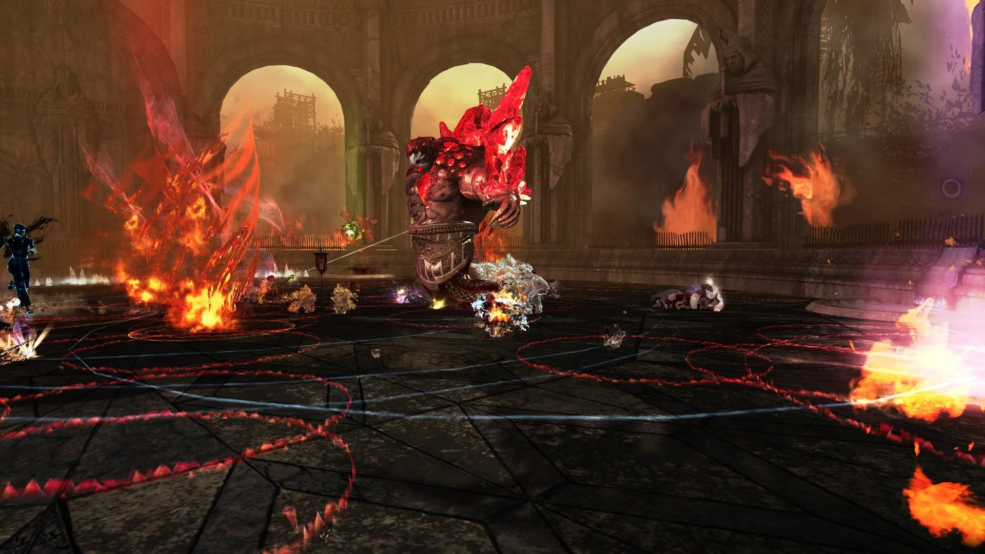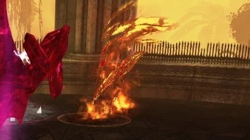 zwei Feuertornados erscheinen, wird man hineingesaugt ist man ein paar Sekunden benommen und bekommt Schaden (der Einsaugradius ist größer als der rote Kreis) man kann sich aber auch mit Fähigkeiten befreien welche Betäubungen aufheben