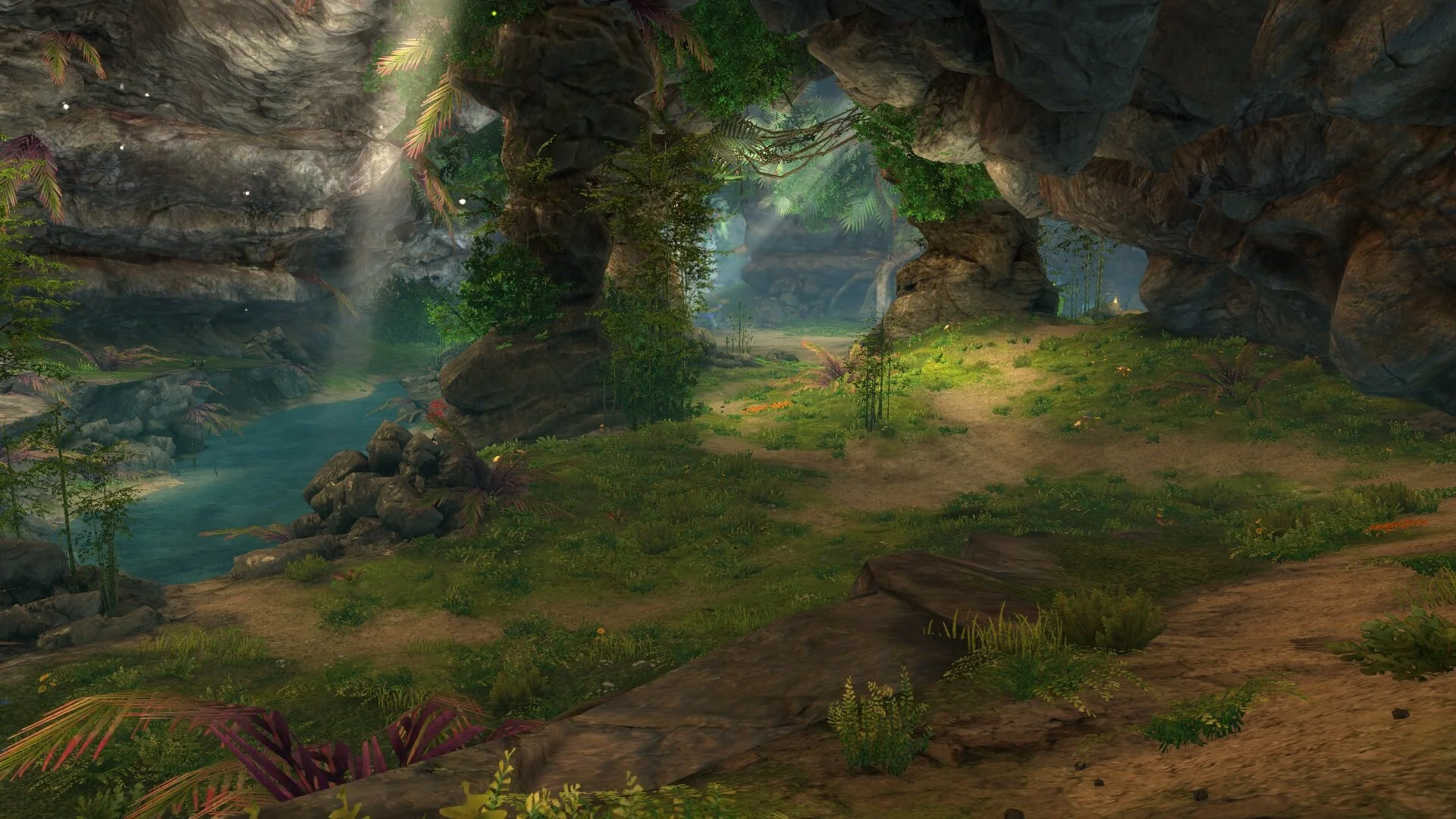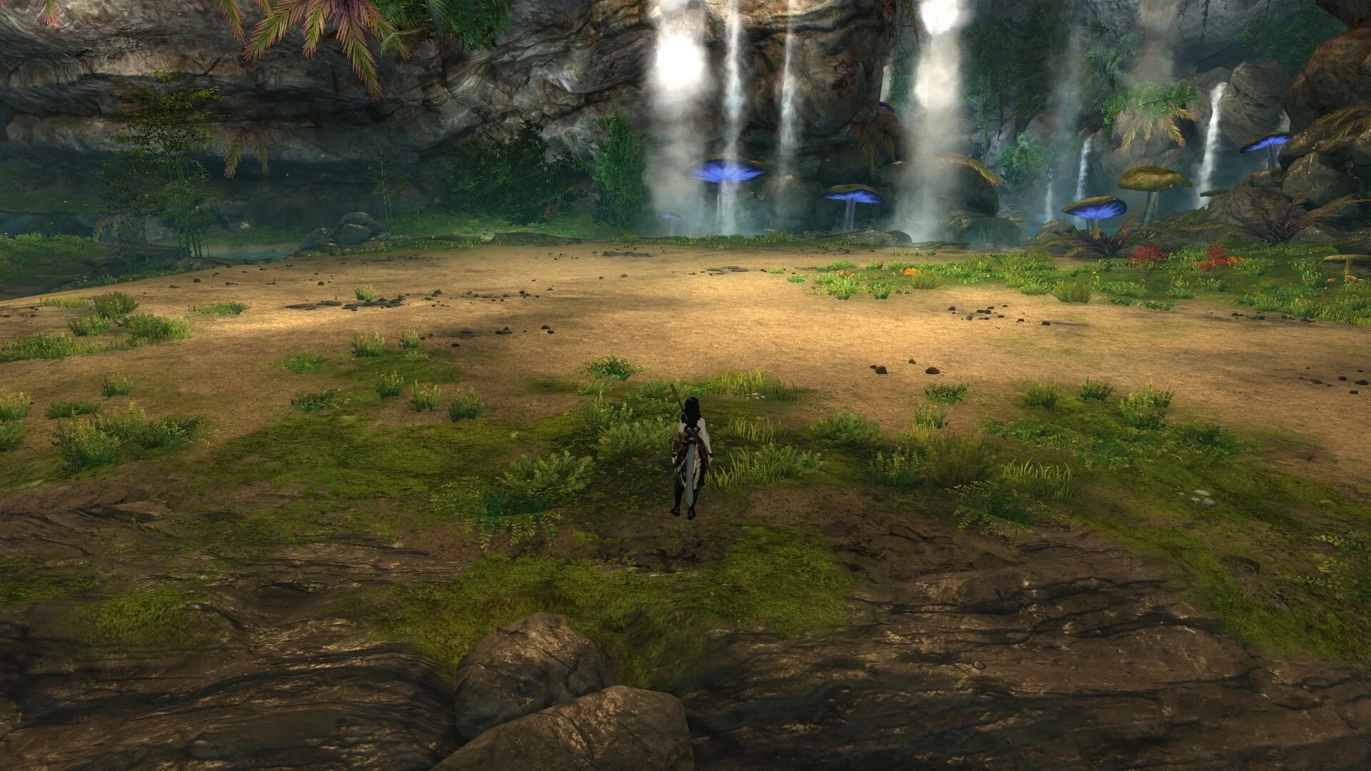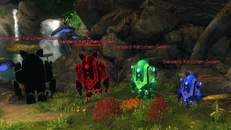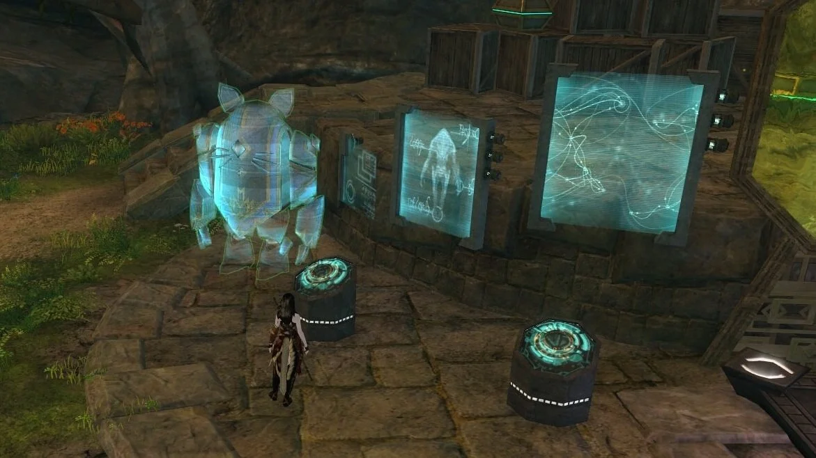 Der tropische Einfluss des nahen Dschungels ist auch an diesem Ort unverkennbar vorhanden. Läuft man den Weg entlang gelangt man zu einer Fläche mit allerlei Geräten. Sehr asurisch angehaucht. Es gibt Konsolen und auch einen Asura den man ansprechen kann, sollte man Fragen haben oder Hilfe brauchen. Rechts des Asuras befindet sich ein breites, runde Feld in dessen Mitte später der Golem erscheinen wird.