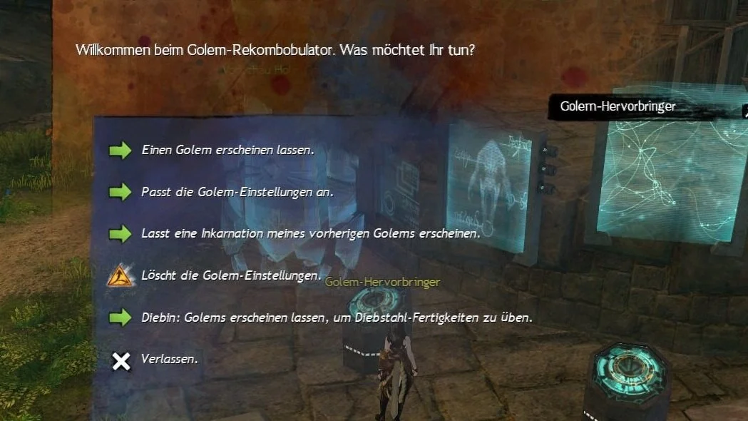 Möchte man den Golem anpassen muss man mit dem Golem-Hervorbringer sprechen. Man hat nun verschiedene Möglichkeiten seinen Golem zu gestallten: