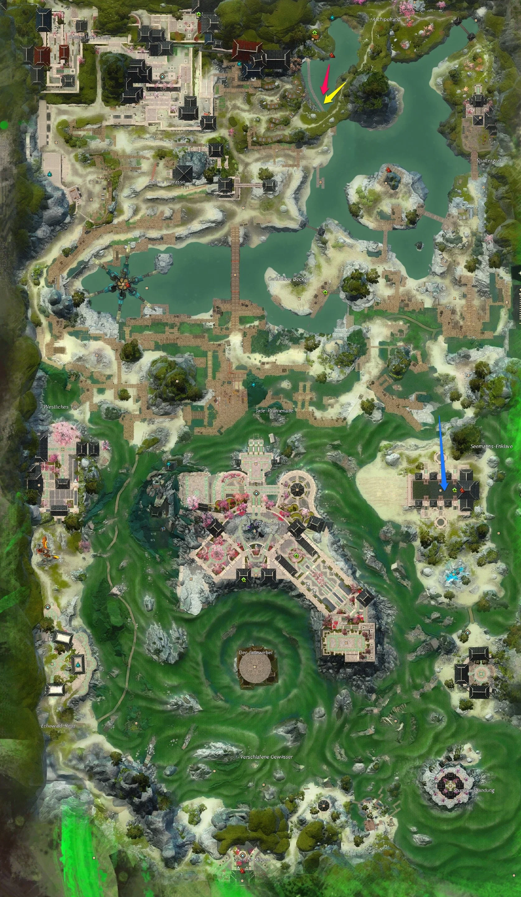 blauer Pfeil = junge Belagerungs-Schildkröte, pinker Pfeil = junge rote Qualle, gelber Pfeil = junge blaue Qualle
