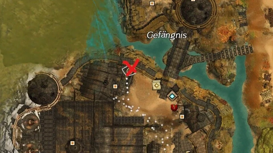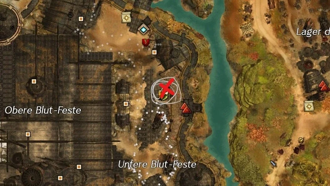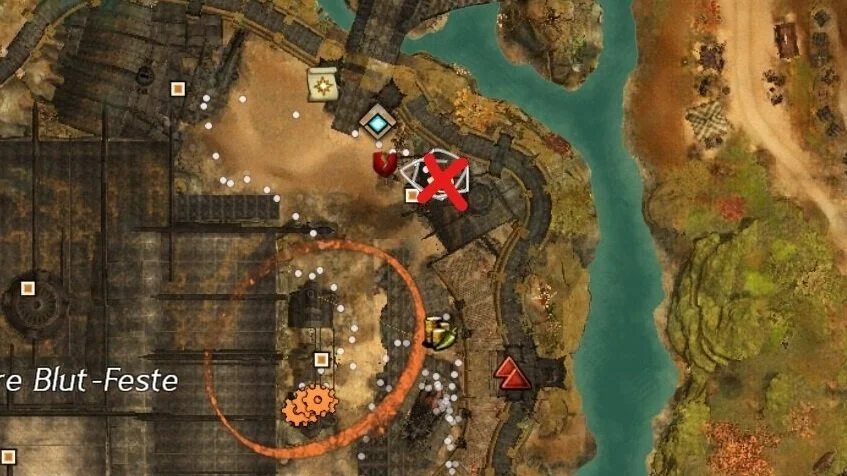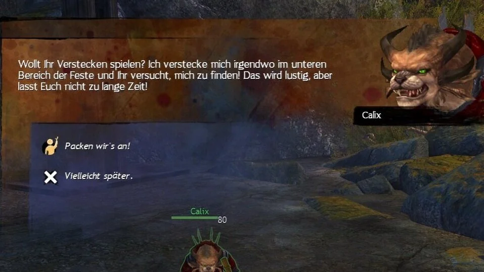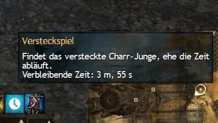 Euer Bildschirm wird nun kurz schwarz werden und dann ist Calix auch schon verschwunden. In eurer Buffleiste habt ihr nun einen neuen Segen: “Versteckspiel: Findet das versteckte Charr-Junge ehe die Zeit abläuft.” Ihr habt dafür 4 Minuten Zeit.