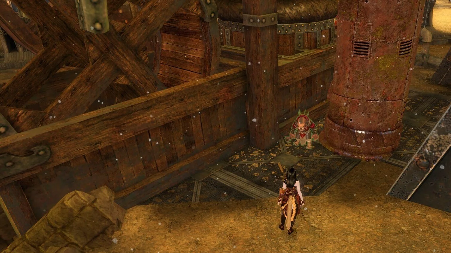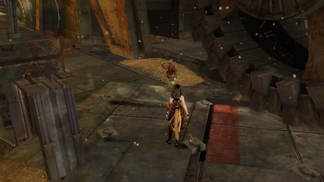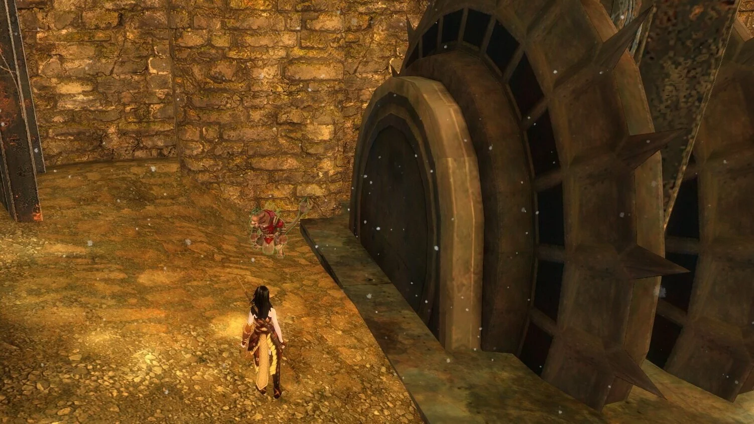 Versteck Nummer 9: Calix versteckt sich rechts vor der Festen-Küche hinter einer ihrer großen Säulen. Die Säule hat ein riesiges Zahnrad als Sockel.
