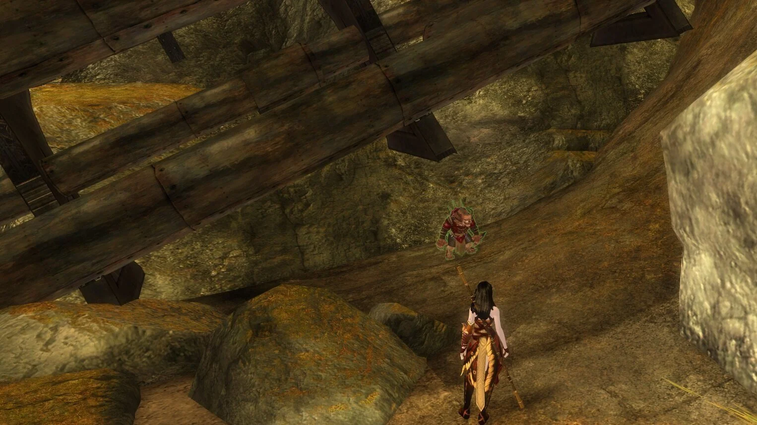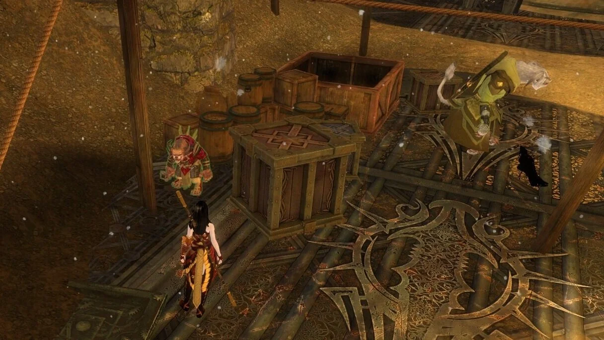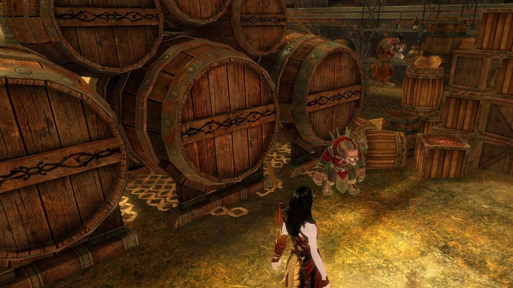 Versteck Nummer 5: Calix versteckt sich hinter den Fässern in der Schänke “Saufbursche”.