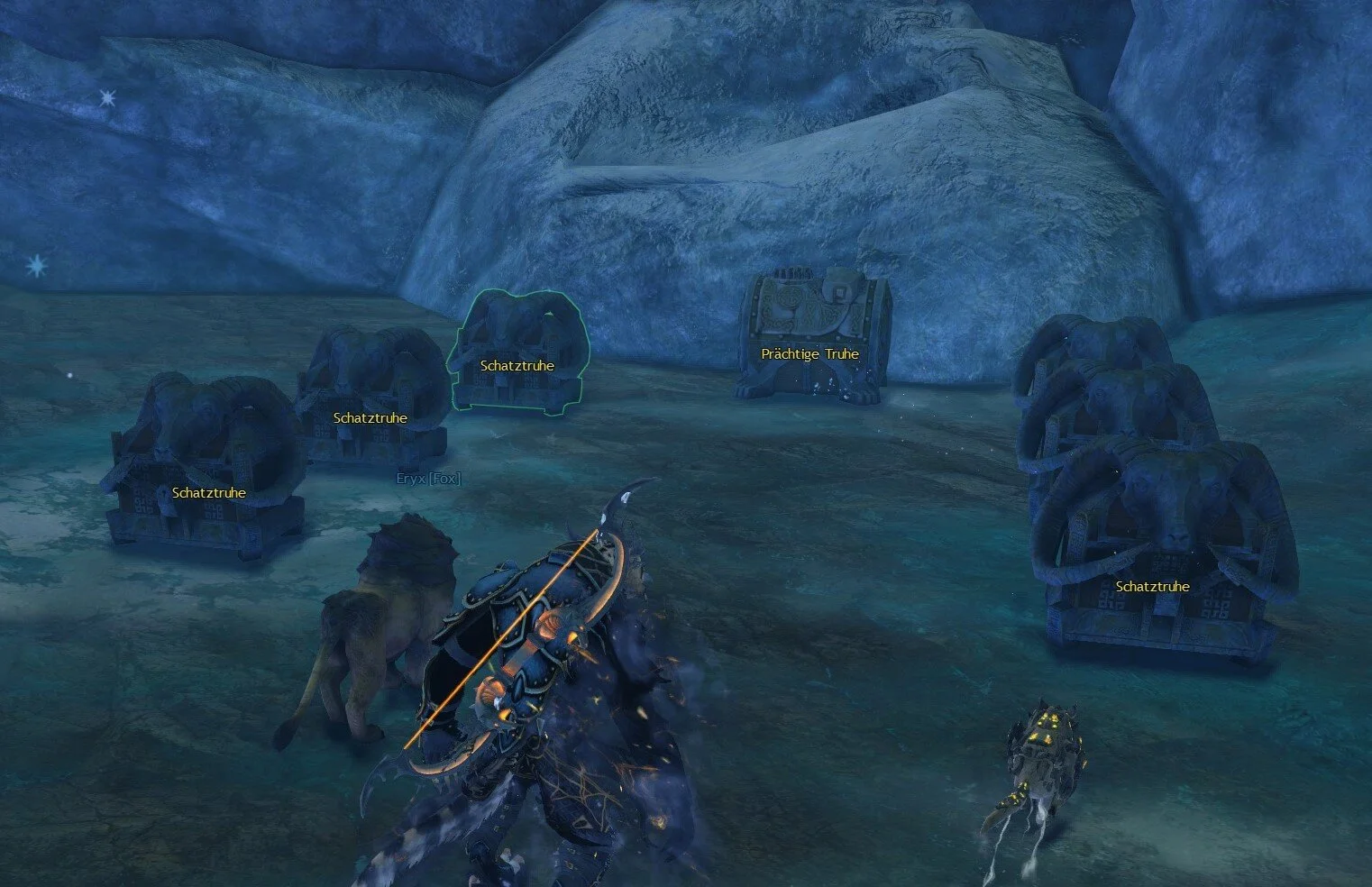 Mit dem großen Tor könnt ihr einfach interagieren (funktioniert nur wenn ihr den Erfolg: Schatz-Schnüffler abgeschlossen habt) und werdet dann in die Höhle dahinter teleportiert. In der Höhle stehen 7 Kisten, 6 Schatztruhen und eine prächtige Truhe, die ihr alle öffnen könnt.
