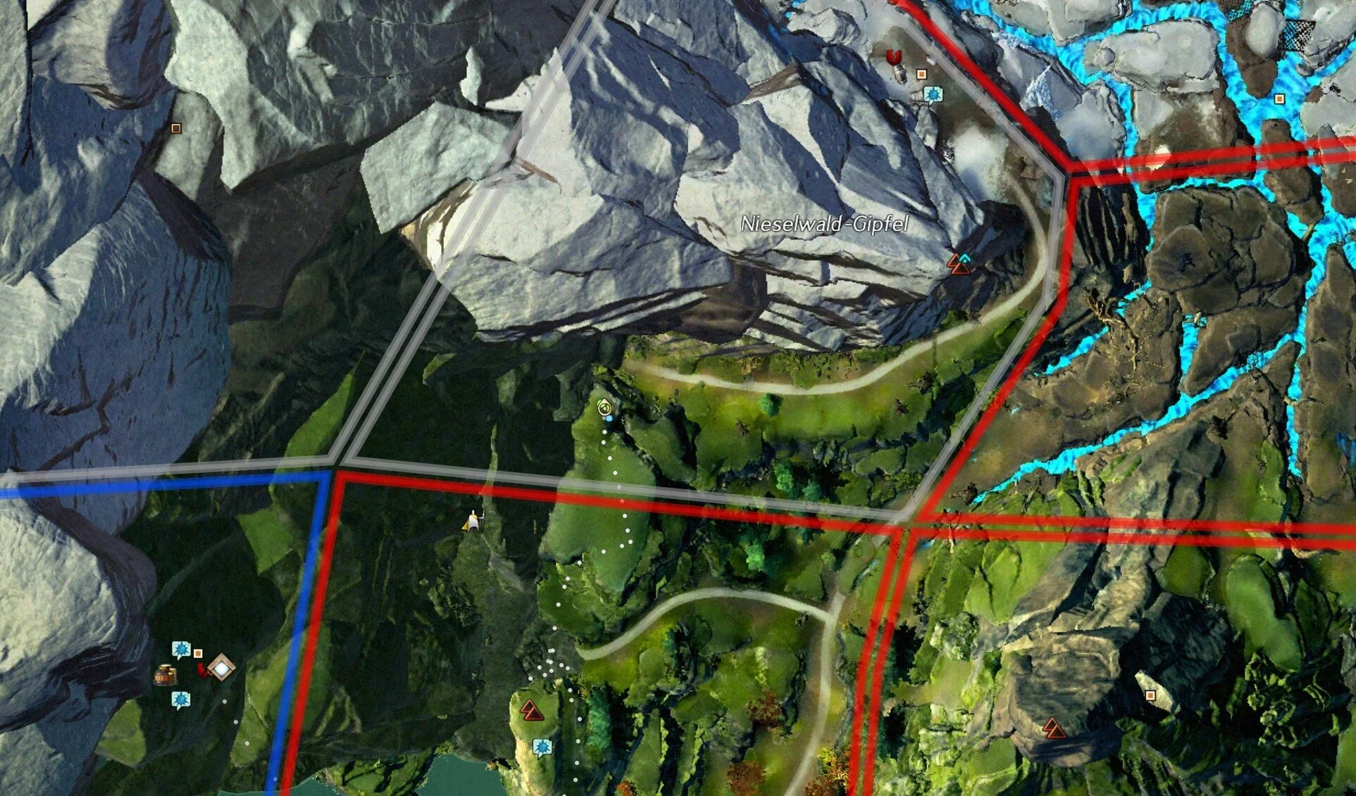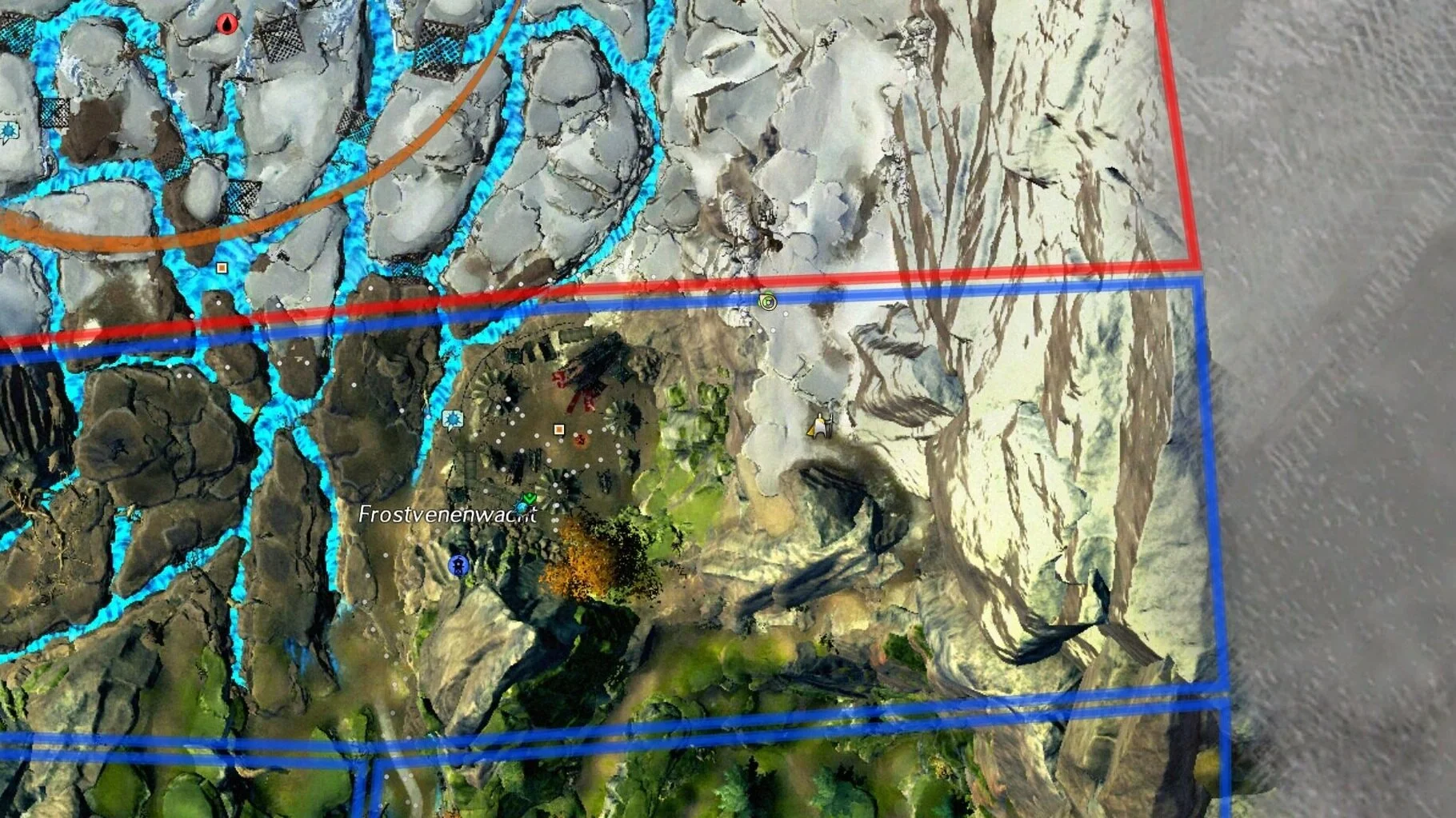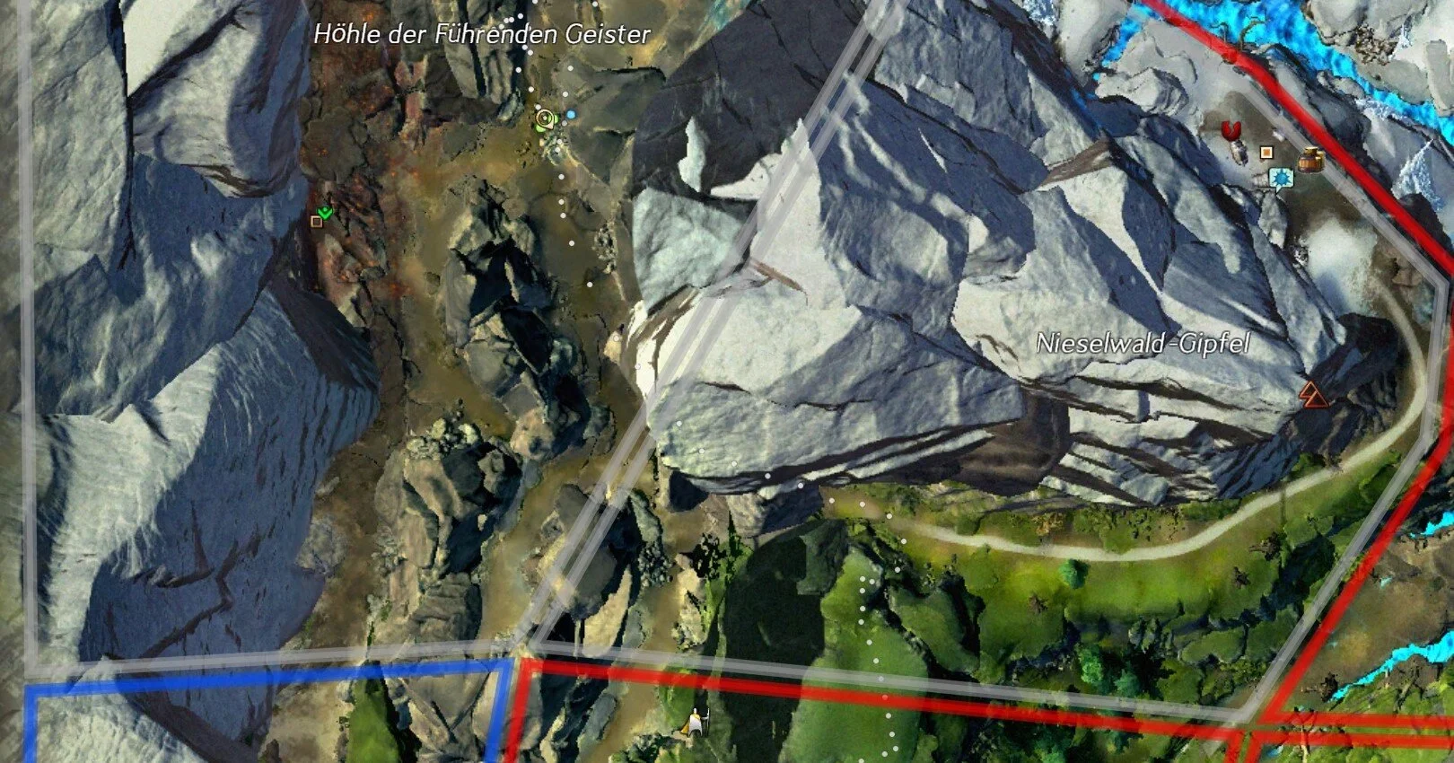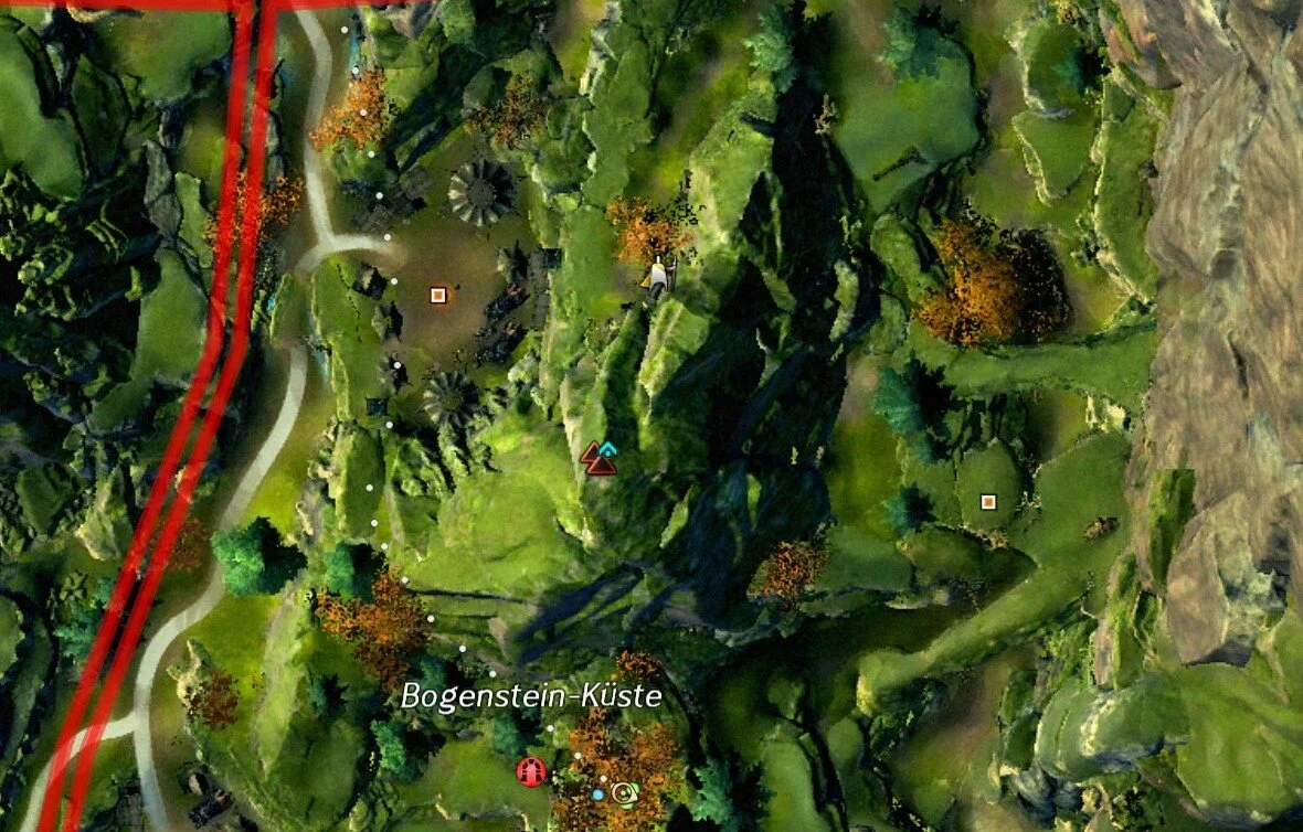 Nachdem wir nun die Hinweise entschlüsselt haben, müssen wir den den Schlüssel zu der geheimen Höhle finden, sowie die Höhle. Auf dem Bild seht ihr alle Position (ihr müsst die Schatzjäger nicht der Reihe nach ansprechen, sollte euch aber ein spezieller fehlen seht ihr auf dem Bild die entsprechende Nummer des Hinweises zu dem er gehört). Wir gehen aber auf jede einzeln auch noch mal ein. Der Start ist bei der Wegmarke: Vorstoßlager [&BHIMAAA=]