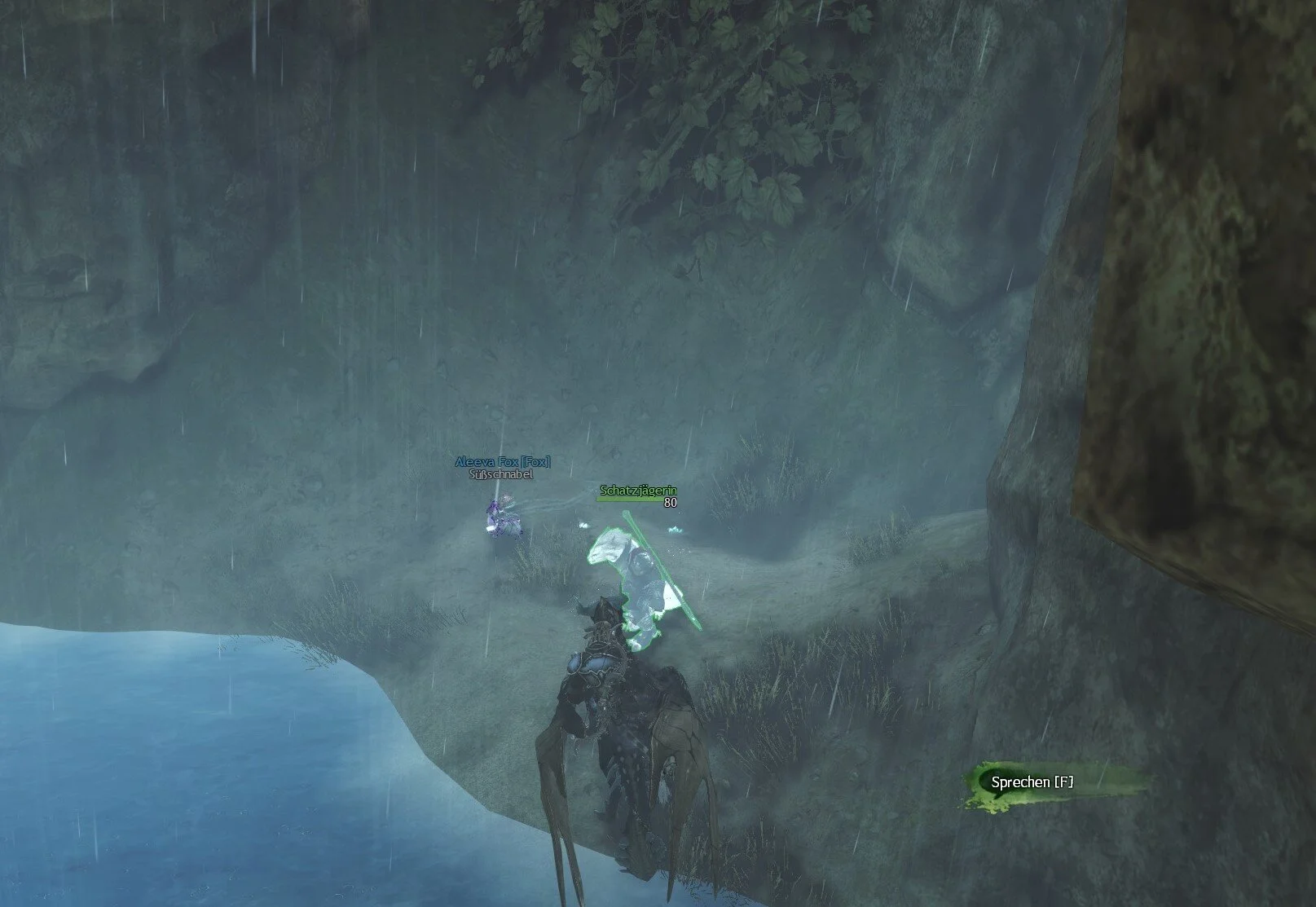 Von der Wegmarke: Vorstoßlager startet ihr nach Süden und springt durch den Wasserfall. Im See vor euch seht ihr nun einen Kreis aus verschieden hoher Steinsäulen. Genau in der Mitte dieser Steinsäulen ist ein Haufen Dreck (ist anwählbar, wird aber nicht durch einen Namen angezeigt). In diesem Haufen Dreck ist das Schwert welches zu einem Schlüssel verzaubert wurde. Ihr bekommt also gleichzeitig noch einen Skin geschenkt.