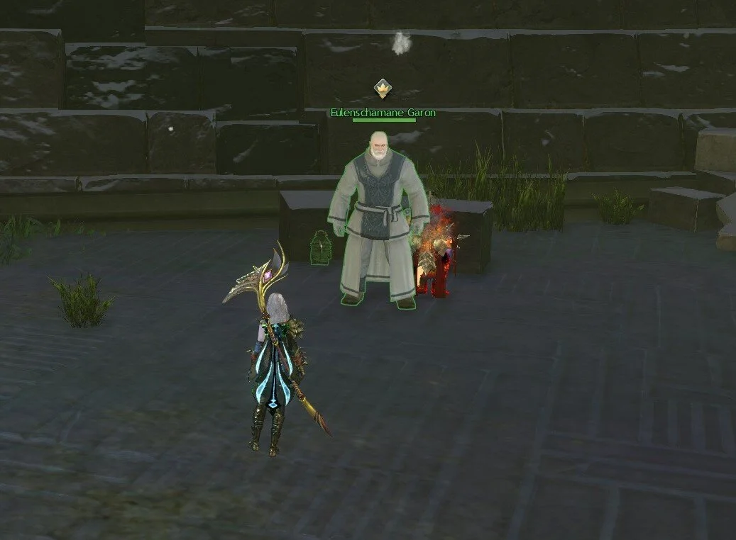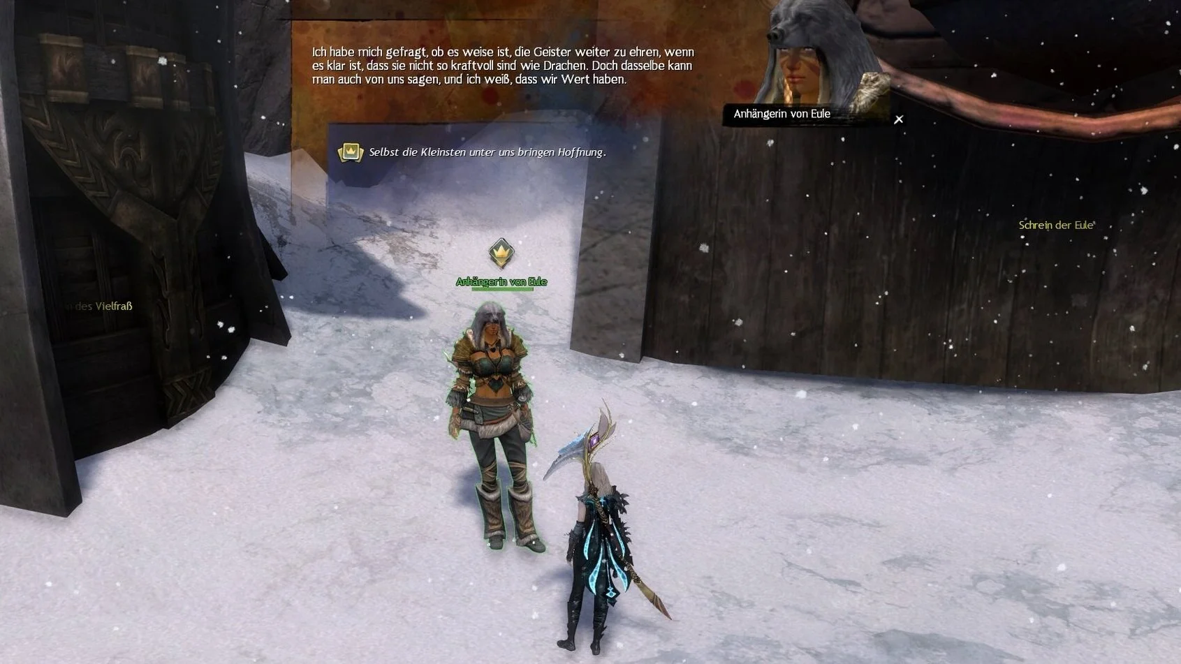 Teleportiert euch in Auge des Nordens, dort steht rechts an der Wand der Eulen Schamane Garon. Lauf ihr in seine Nähe schaltet sich der Erfolg frei (wenn ihr die Geschichte gespielt habt). Nach einem kurzen Dialog, an dessen Ende er euch fragt ob ihr ihn begleiten wollt, habt ihr Nummer 1 auch schon geschafft.
