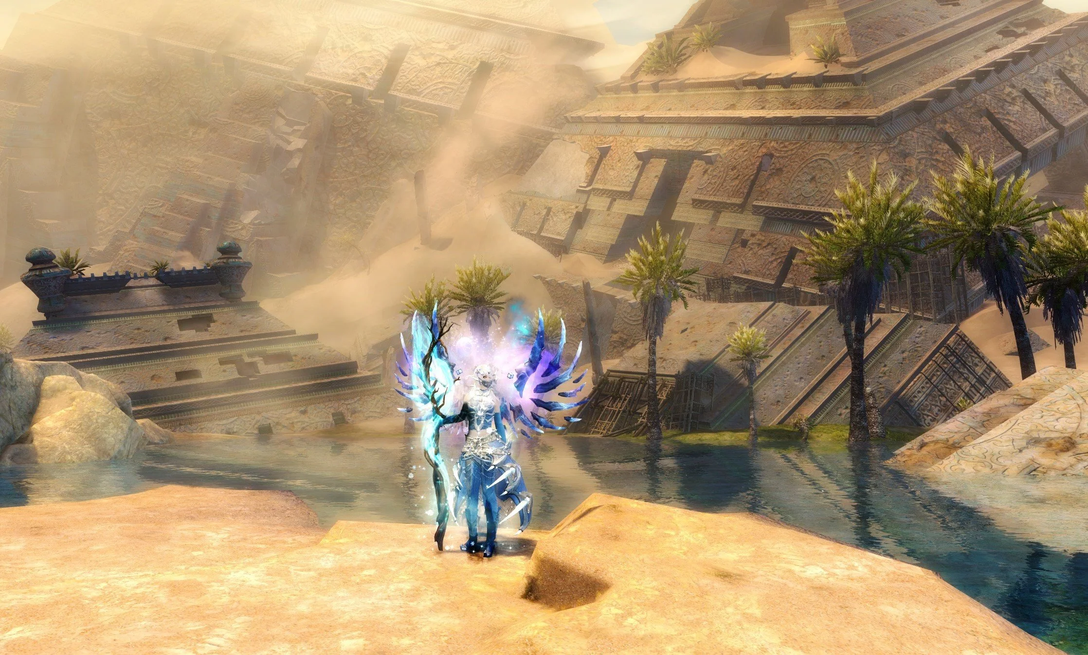 Als Waffen wählen wir einmal Zepter und Schild, und als zweite Waffe Stab. Durch den Stab können wir Zustände verteilen, CC machen, Segen verteilen und schnell zwei Illusionen erschaffen (einen Klon und ein Trugbild).