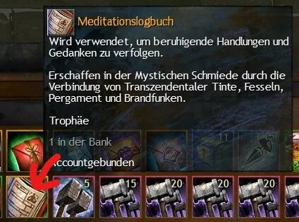 Um das Logbuch herzustellen müsst ihr zur Mystischen Schmiede gehen und die Fessel, das Pergament, die Tinte und 100 Pulsierende Brandfunken zusammen in die Schmiede werfen.