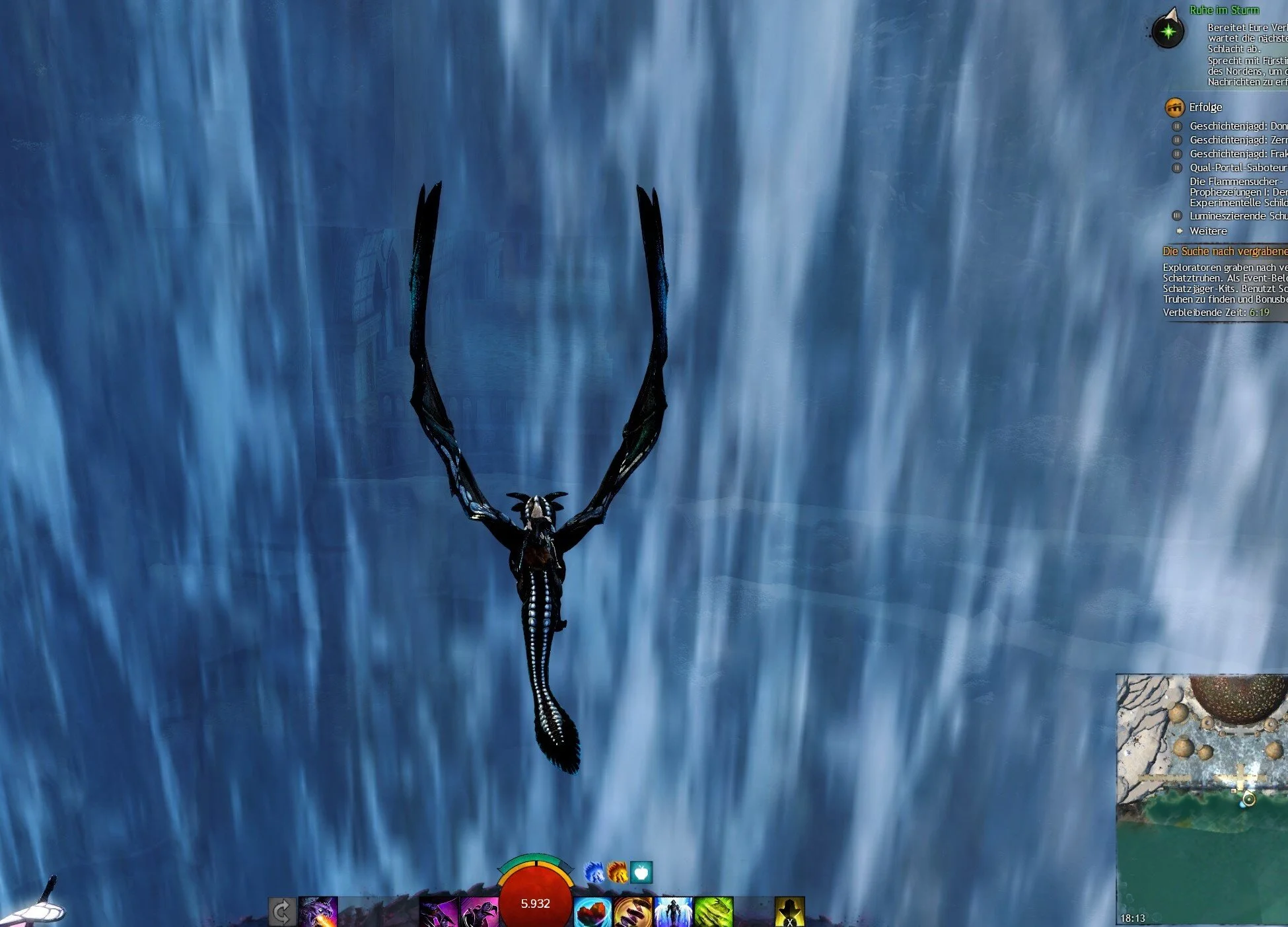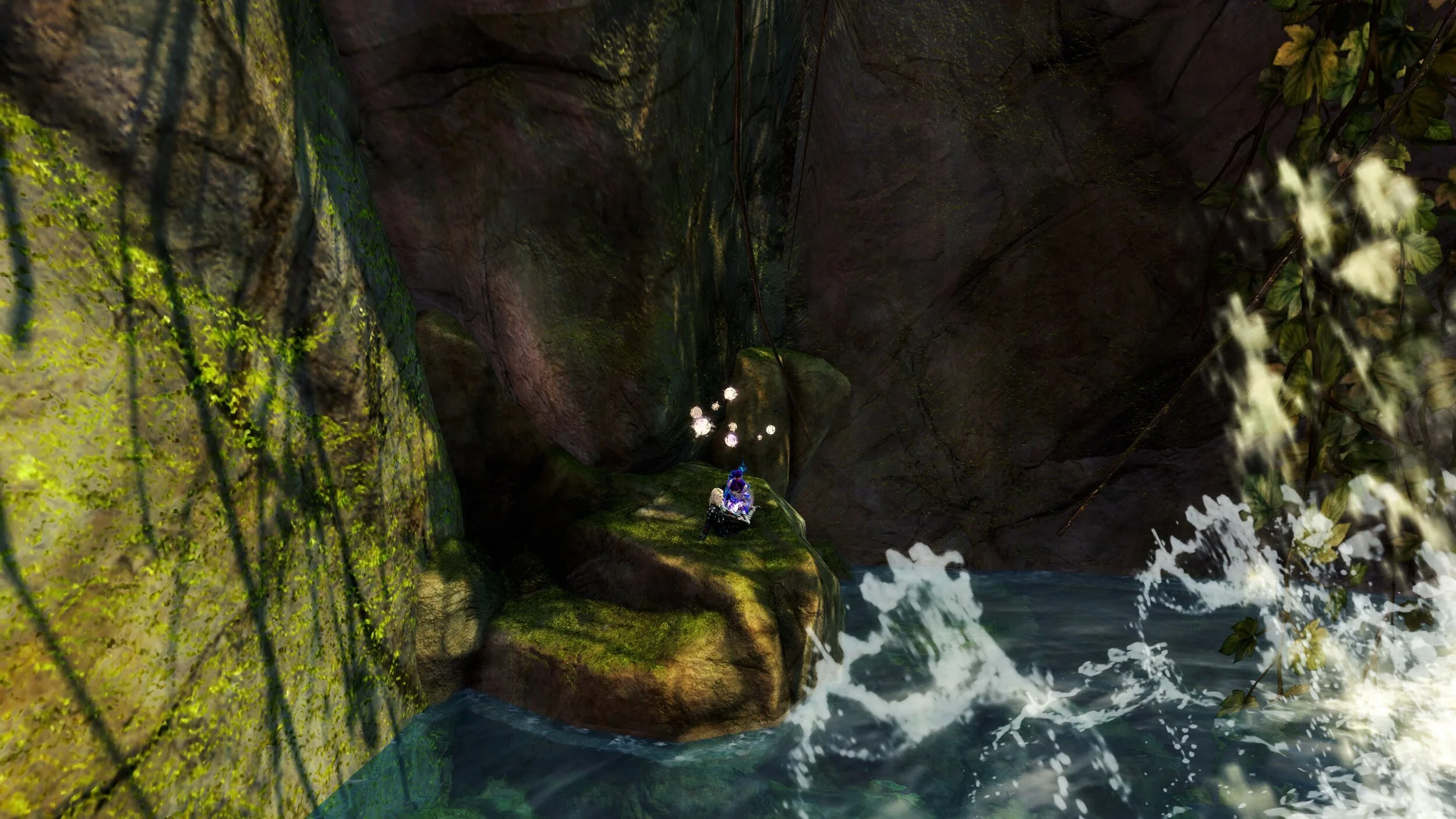 Dann weiter nach Süden zu den Verzauberten Klippen. Wo der riesige Wasserfall ist gibt es etwa auf der Hälfte, hinter dem Wasser versteckt, einen kleinen Balkon. Man kann entweder über die Ruinen dort hingelangen, einfacher ist es aber von oben herunter zuspringen und entweder mit der Himmelschuppe oder durch Gleiten durch das Wasser zu kommen und auf dem Balkon zu landen.