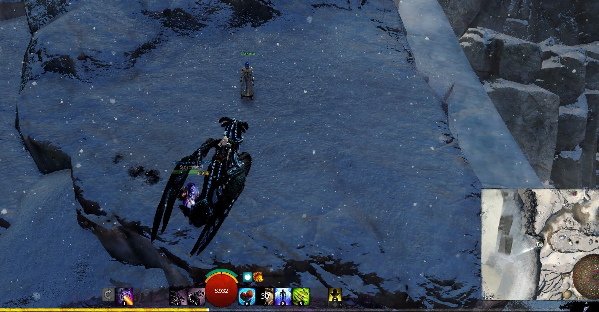 Dann nach Süden, am linken Rand der Karte entlang, Hasara steht dann auf einem Felsen. Nach einem kurzen Dialog können wir ihm das Buch abgeben und bekommen unseren Precursor-Ring: Hasserfüllter Wirbel. Und die zweite Sammlung schaltet sich automatisch frei: Koaleszenz: Das Geschenk.