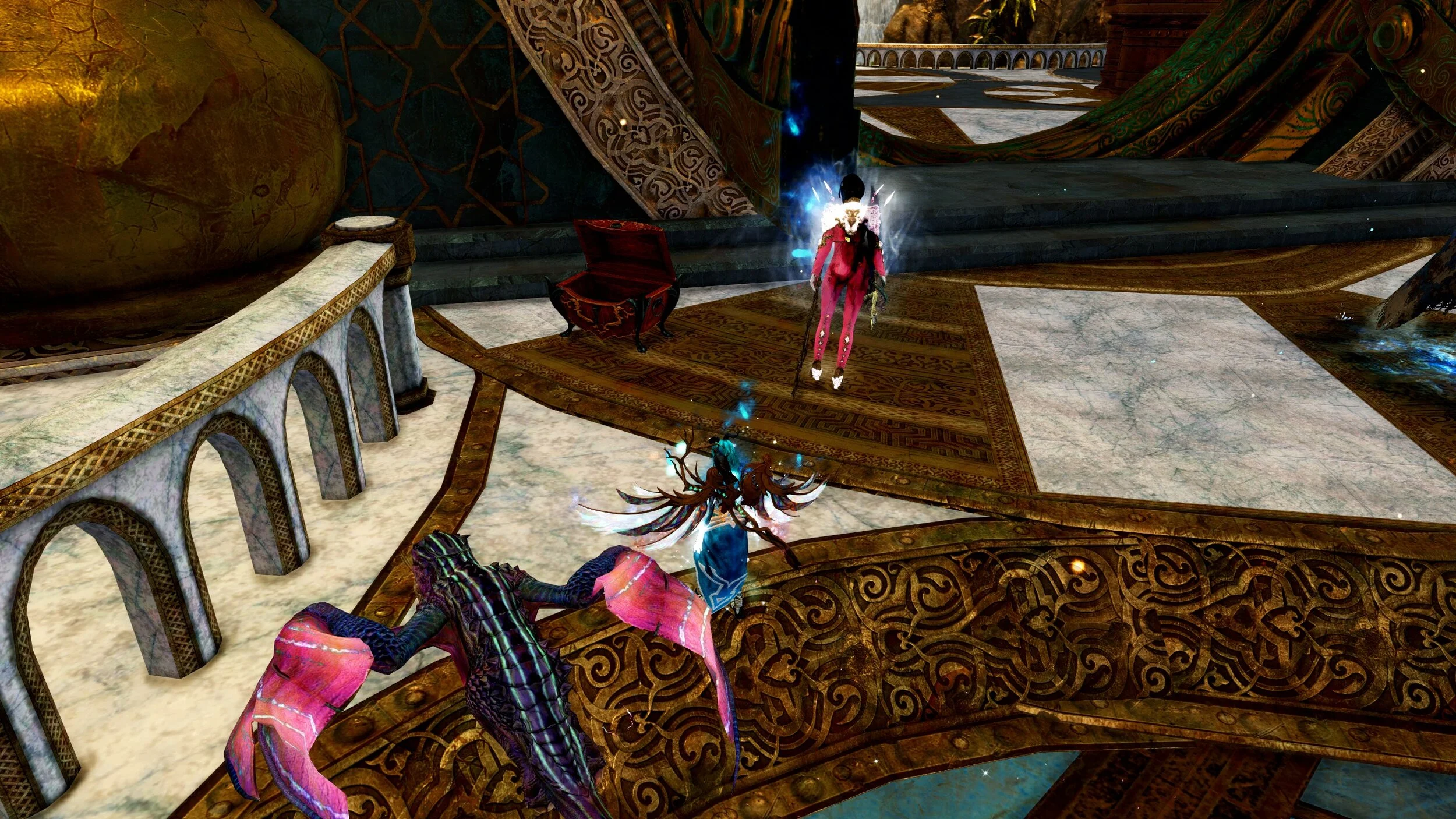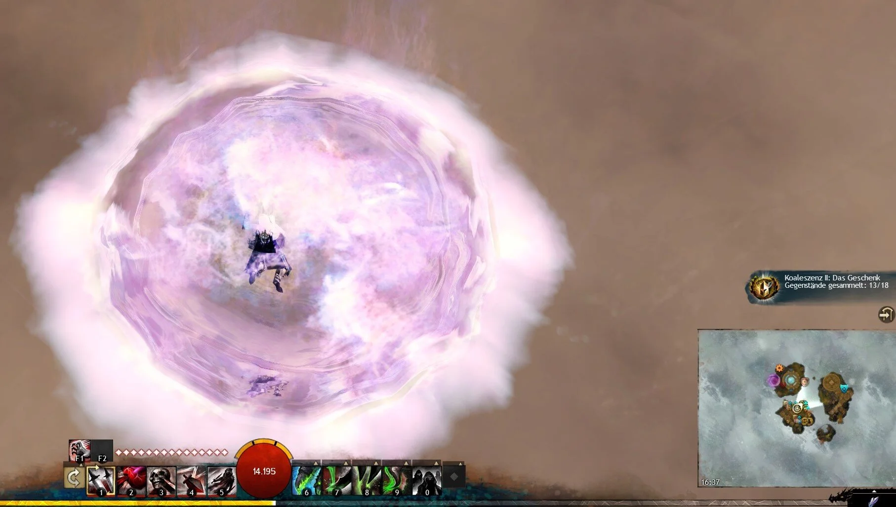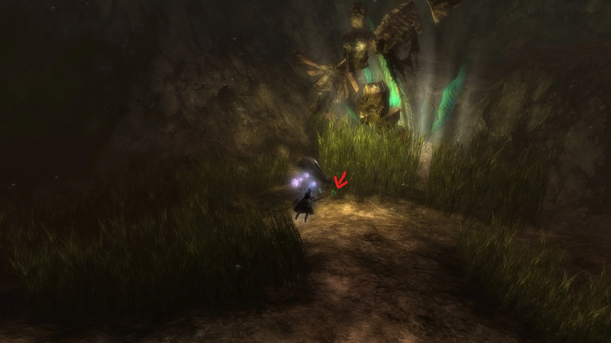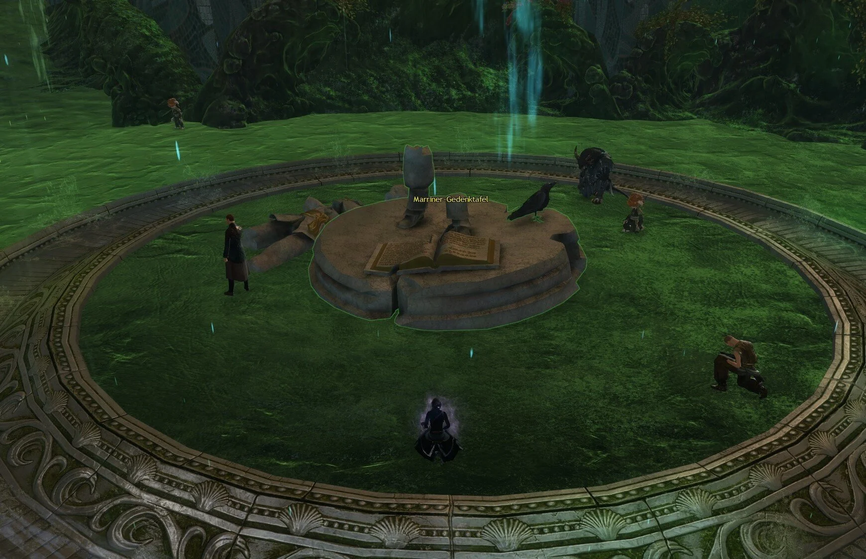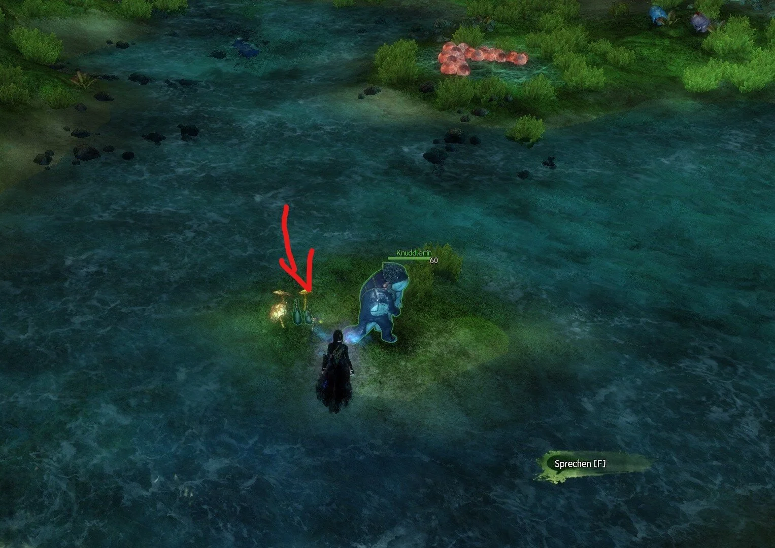 Dann nach süd-westen und tauchen in dem kleinen Tümpel hinab zur Statue von Dwayna, zu dessen Füßen wir die Flasche einsammeln können.