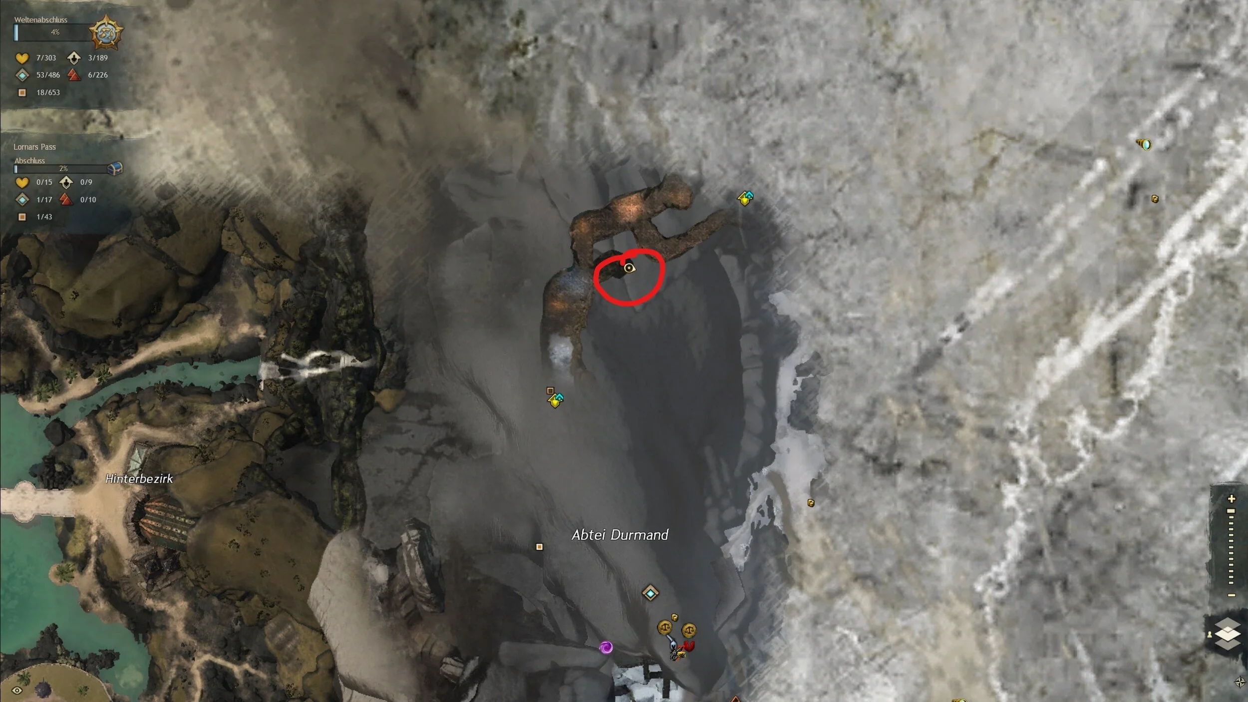 Am einfachsten kommt ihr von der Wegmarke: Abtei Durmand [&BOkAAAA=] dorthin. Verlasst die Abtei nach Süd-Westen, dort befindet sich der Eingang zu einem Höhlen System, folgt der Höhle.