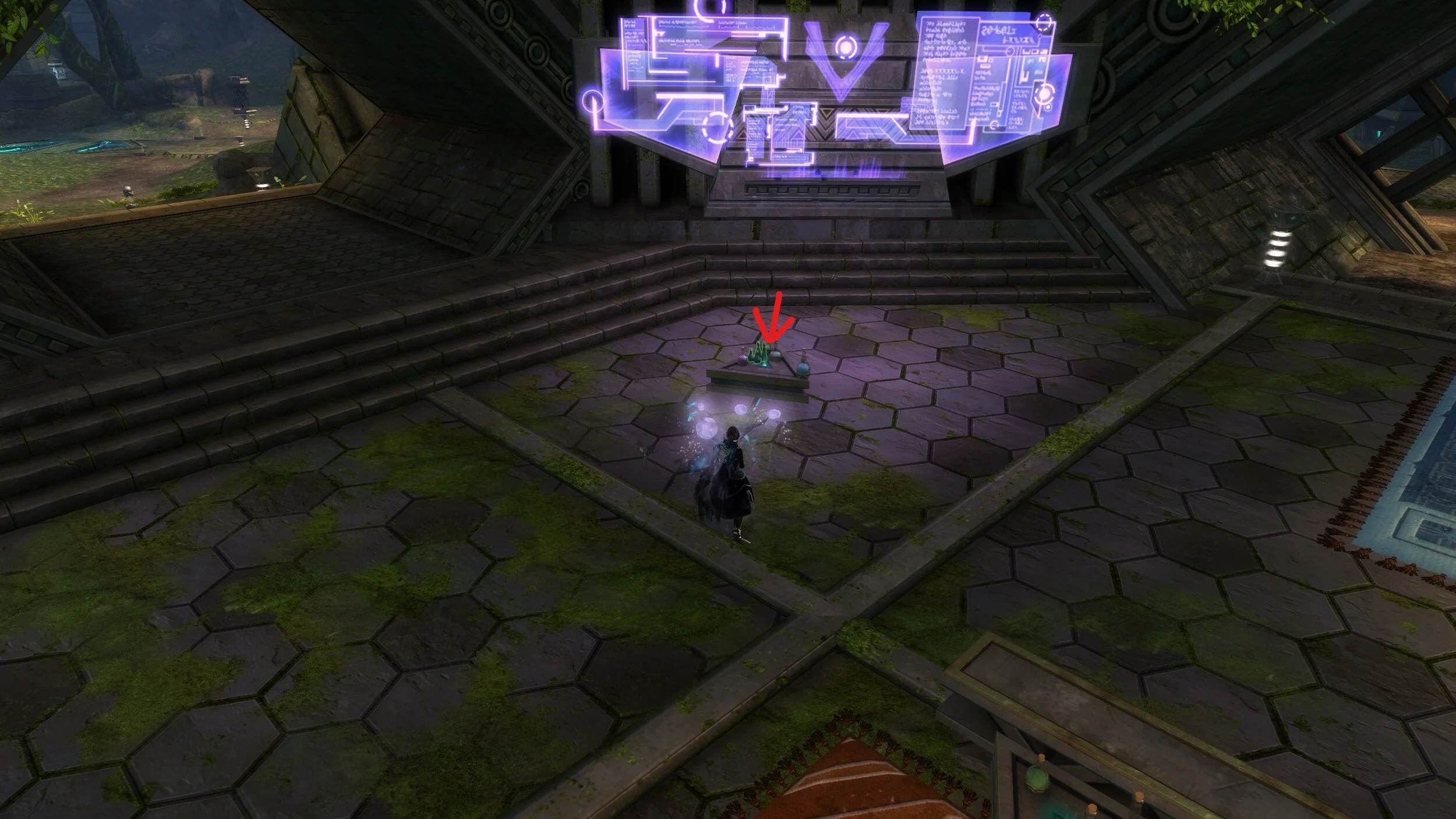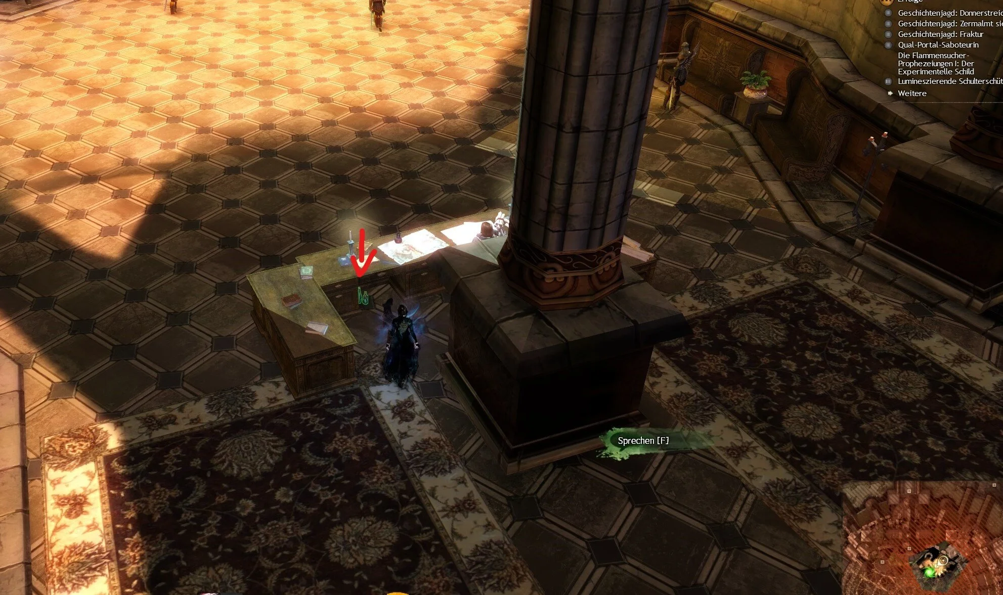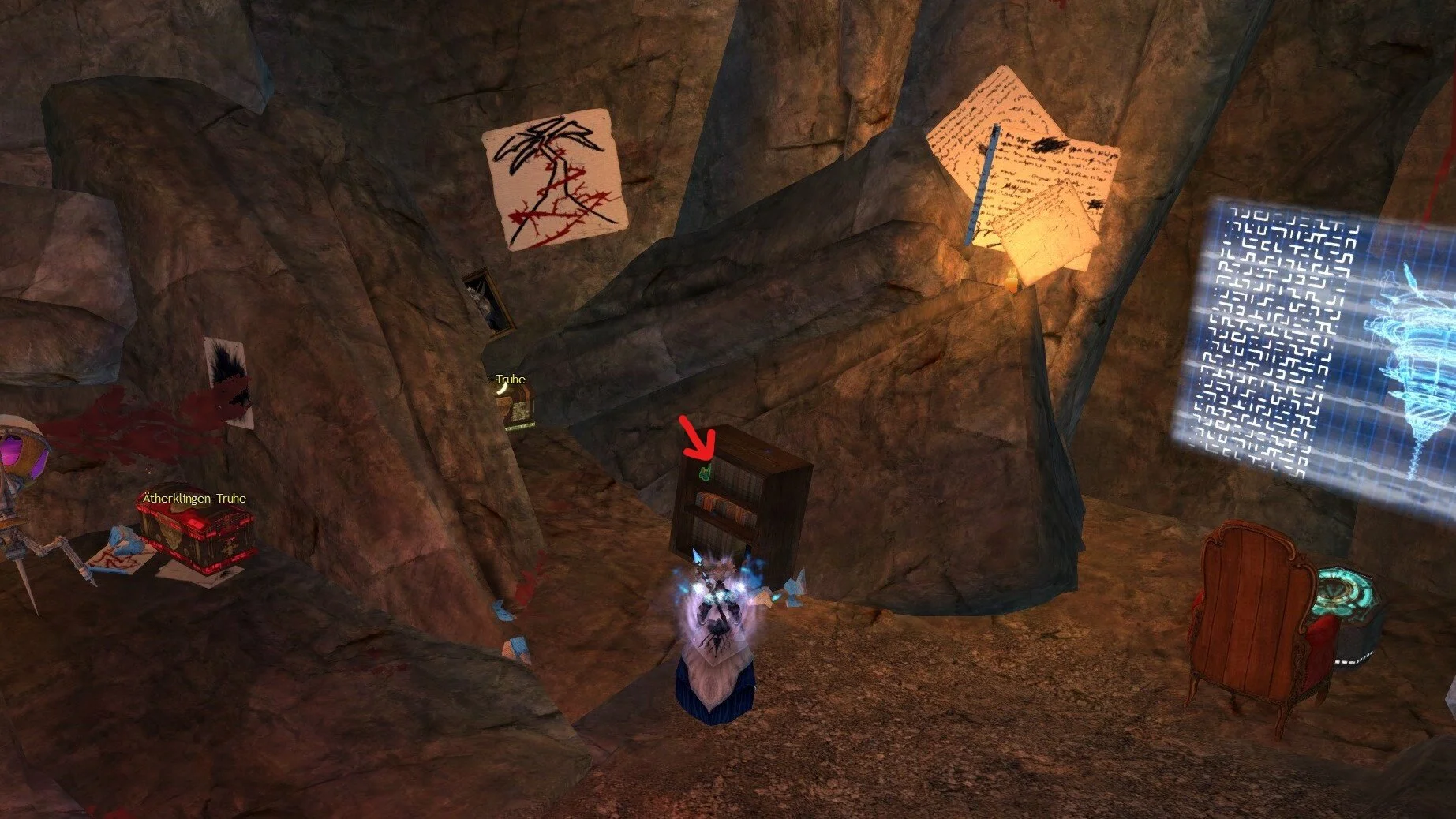 Um die Flasche zu füllen müssen wir in die dunkle Bibliothek und dort mit dem Refugiums-Bibliothekar sprechen. Man teleportiert sich am einfachsten zur Wegmarke: Lommuld-Kral [&BGoKAAA=] im Wüsten-Hochland und geht dann nach Osten zum Grab der Altehrwürdigen Könige. Dann ganz nach Hinten und kann dort an einer Wand interagieren und ein Portal öffnen.