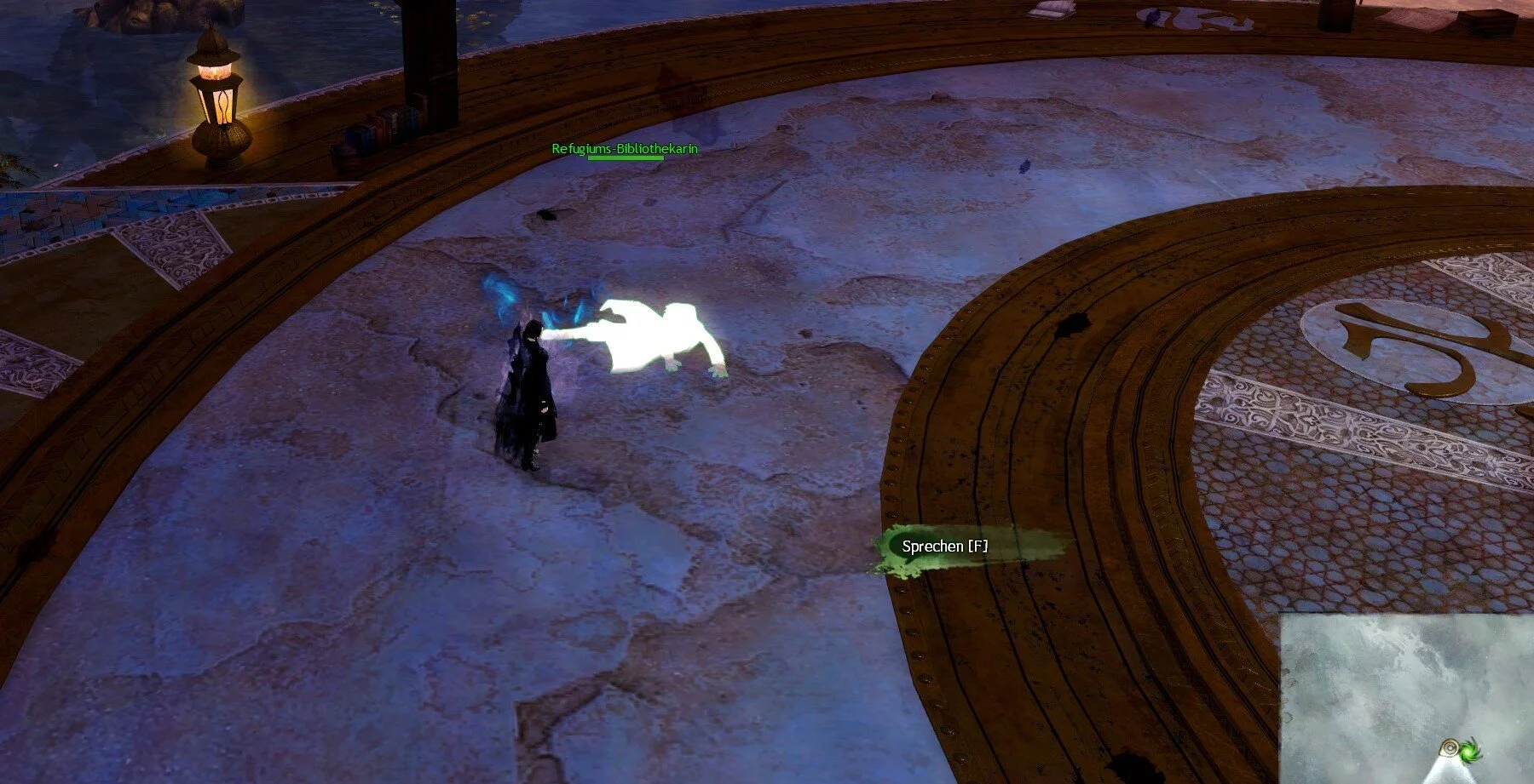 Geht man durch dieses Portal gelangt man zur dunklen Bibliothek, einige Schritte vor einem am Boden liegt dann der Refugiums-Bibliothekar und wir können mit ihm sprechen, die Flasche wird daraufhin gefüllt.