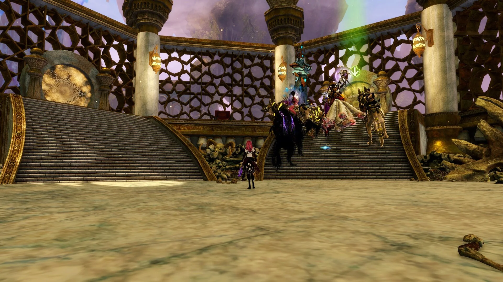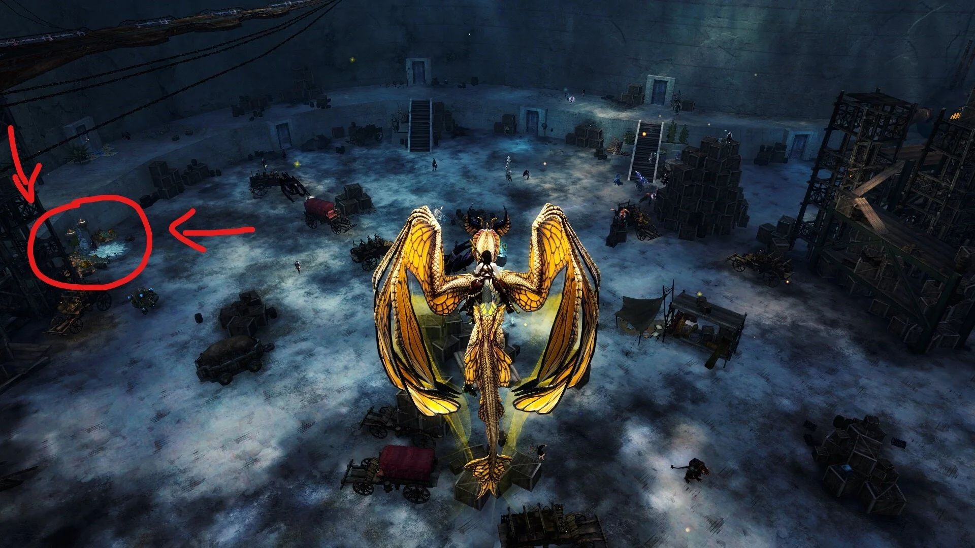 Haben wir Wing 6 betreten fallen wir direkt hinunter und können auch am Anfang unseren Gleiter nicht öffnen. Keine Sorge, auch wenn ihr den Gleiter später nicht öffnet sterbt ihr nicht, zu Beginn gibt es keinen Fallschaden. Zommoros und Glenna beginnen ein Gespräch und laufen sehr langsam in Richtung der Bossplattform. Ihr könnt die Bosspalttform erst betreten wenn Zommoros und Glenna ihr Gespräch beendet haben und die Beschworene Verschmelzung erschienen ist. Versucht ihr es früher werdet ihr immer wieder zurück zu Zommoros und Glenna teleportiert. Ist das Gespräch beendet könnt ihr mit einem Reittier zur Bossplattform springen oder fliegen.