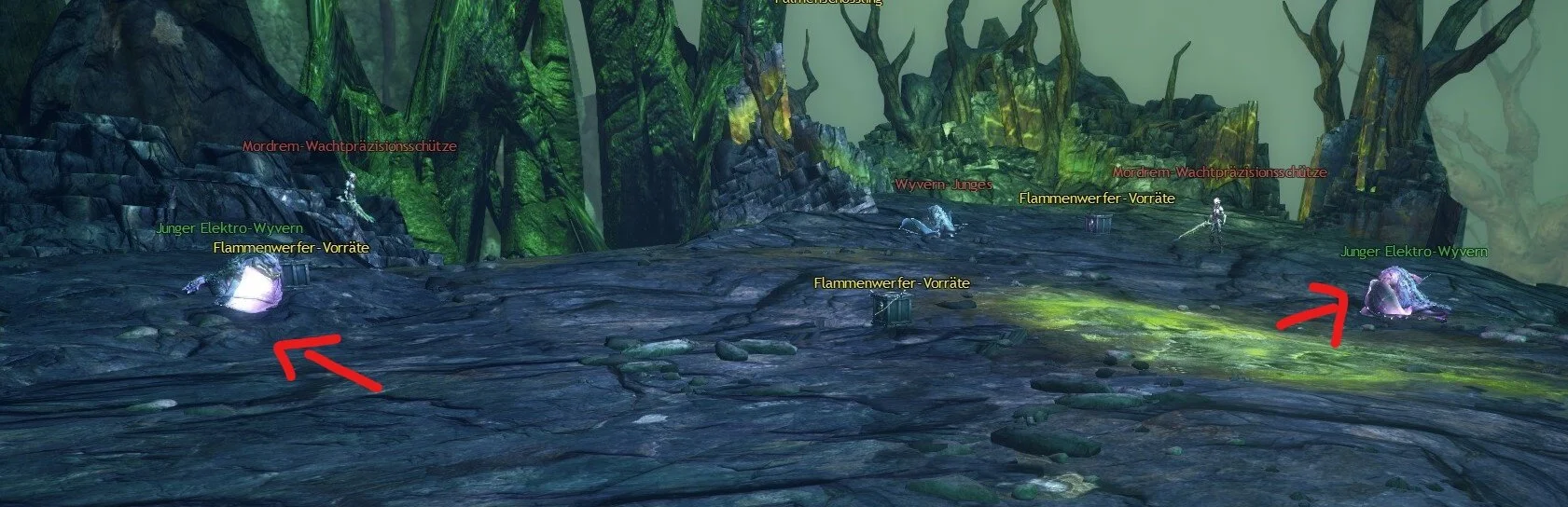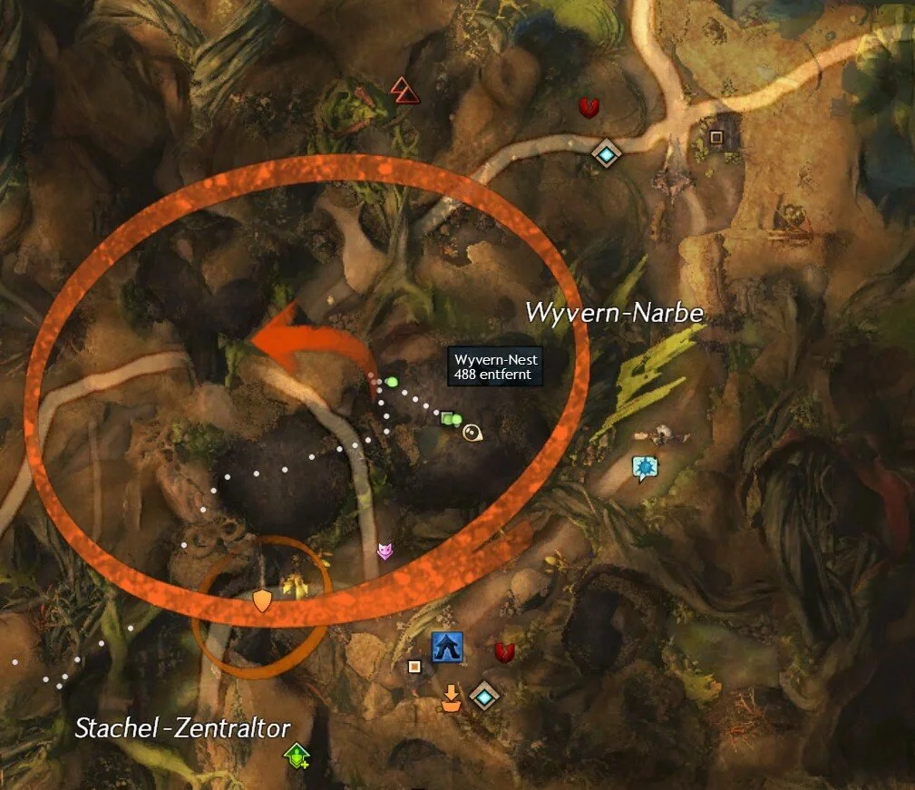 - Widerstand des Drachen: Direkt beim Wyvern-Nest [&BEwIAAA=] allerdings erst sobald das beim Meta-Event das Event: “Klettert hoch und sammelt die Flammenwerfer-Vorräte ein.” aktiv wird, dieses kommt sobald die Wegmarke Zentrales vorgeschobenes Lager [&BFMIAAA=] freigeschaltet wurde